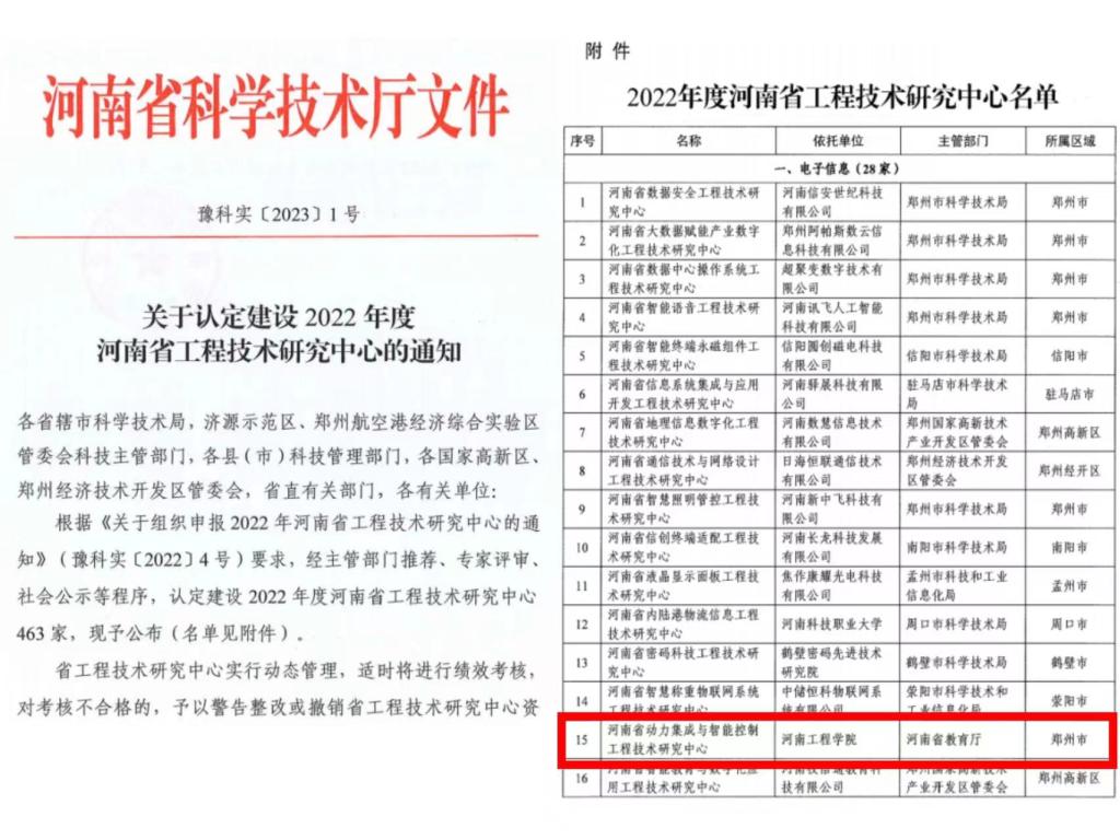 近日,河南省科技厅豫科实〔2023〕1号文件通知,beat365官网电气信息工程学院申报的“河南省动力集成与智能控制工程技术研究中心”获批立项建设。省工程技术研究中心是根据《关于组织申报2022年河南省工程技术研究中心的通知》(豫科实〔2022〕4号)要求,紧密围绕我省战略性新兴产业和beat365官网重点支持的优势专业开展建设,经教育厅推荐、专家评审、社会公示、科技厅认定等程序后立项,全省共立项463家。校领导对本次中心申报高度重视,带领科研处等部门及科研团队负责人积极开展申报研讨会,协调沟通,凝练研究方向,最终确定beat365官网工程技术研究中心的申报材料。