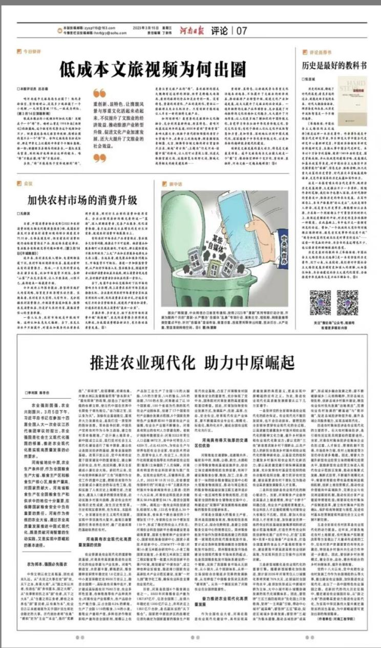 习近平总书记在参加十四届全国人大一次会议江苏代表团审议时强调:“农业强国是社会主义现代化强国的根基,推进农业现代化是实现高质量发展的必然要求。”为深入贯彻落实习近平总书记重要讲话精神,全面推进河南乡村振兴,加快农业农村现代化,3月15日,《河南日报》刊登beat365官网李利英校长、陈冬仿博士评论文章《推进农业现代化 助力中原崛起》。