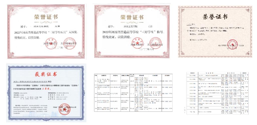 她对创新创业有浓厚的兴趣,在李亚林老师和刘蕾老师的指导下,王倩同学和“玩固Π”团队成员着手参加众多大学生科创竞赛。从最初的想法,到落实文字计划,再到成果展现。从无到有的过程,包含了老师的用心良苦、悉心指导和团队各成员的积极努力,迎难而上。众多省级竞赛都会看到她获奖的身影,如:“2021年河南省‘互联网+’大学生创新创业大赛暨第七届中国国际‘互联网+’大学生创新创业大赛河南赛区选拔赛三等奖”“2022年河南省‘互联网+’大学生创新创业大赛暨第八届中国国际‘互联网+’大学生创新创业大赛河南赛区选拔赛三等奖”“2022年‘挑战杯’河南省大学生创业计划竞赛三等奖”。