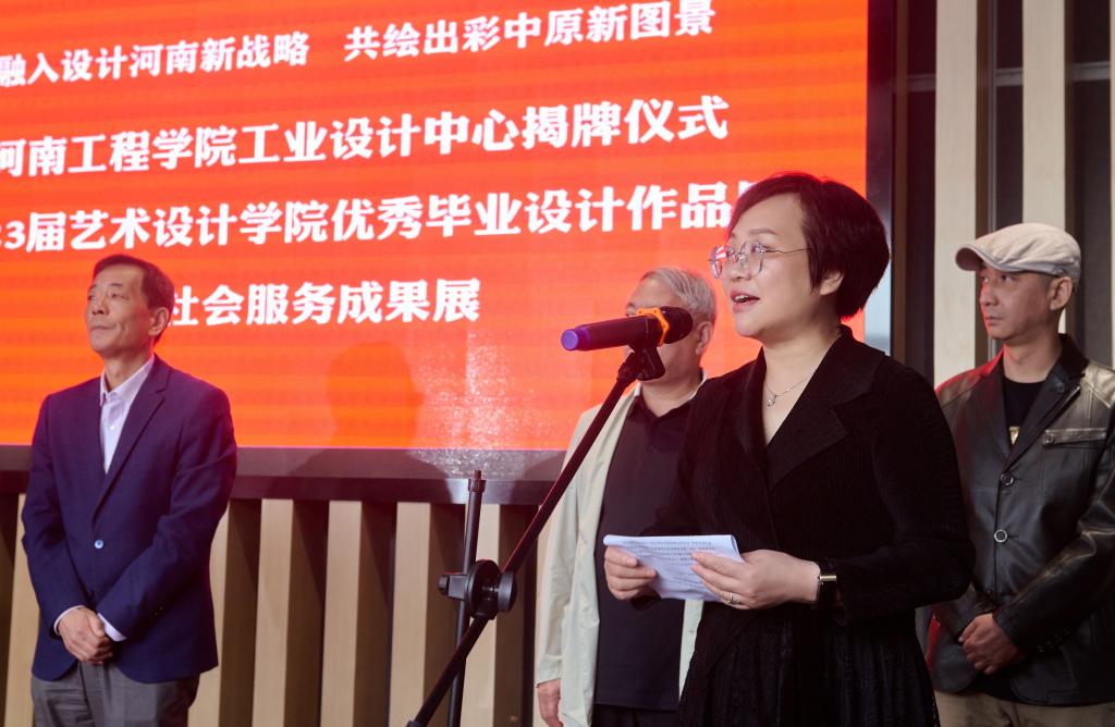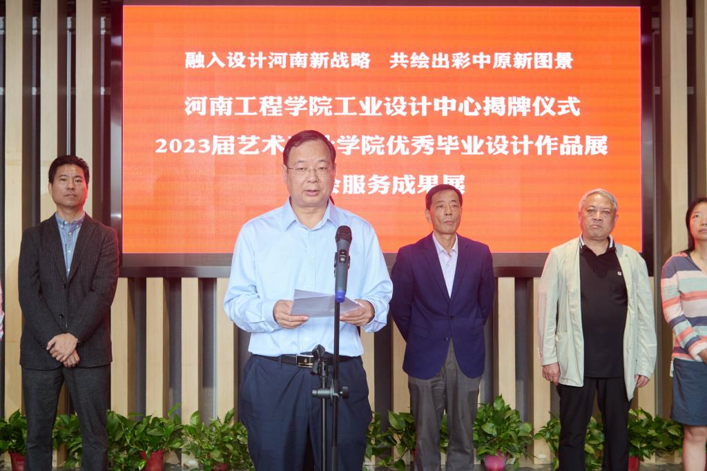 校纪委书记李德耀致辞。他代表学校对各位领导、嘉宾的到来表示热烈的欢迎,对一直以来关心和支持学校发展的上级部门和各界朋友表示衷心的感谢。他指出,河南省为推动“十大河南”建设,充分发挥设计产业对创新驱动发展、赋能产业升级、繁荣中原文化、焕新城乡面貌、创造美好生活的先导性、战略性和支撑性作用,于2022年出台了设计河南建设中长期规划及行动方案,根据设计河南建设要求和河南省教育事业发展情况,学校立足应用型办学定位和行业特色背景,主动服务行业和地方经济社会发展,坚持产教融合、校企合作,在工业设计中心建设过程中,中心依托学校工业软件产业学院、工业软件产业研究院、智能制造工程实践创新中心“两院一中心”积极推进工作。艺术设计学院充分发挥工业设计中心平台的示范引领作用,聚焦乡村振兴、城市更新、数字设计、遗产保护四大板块,紧紧围绕高水平应用型本科定位,不断探索学院发展新路径,积极搭建科研工作新平台,全面促进科研教学新融合,初步探索出了社会服务与实践教学的双驱模式。