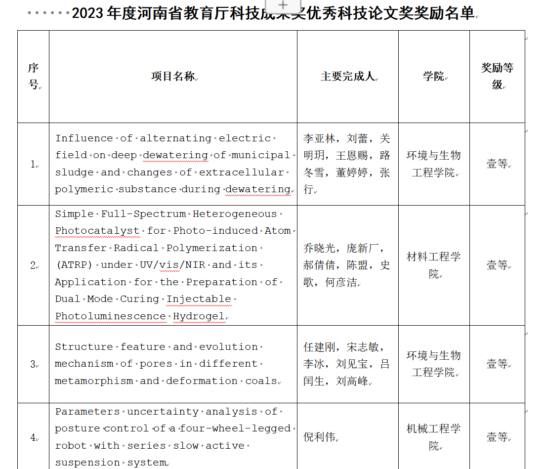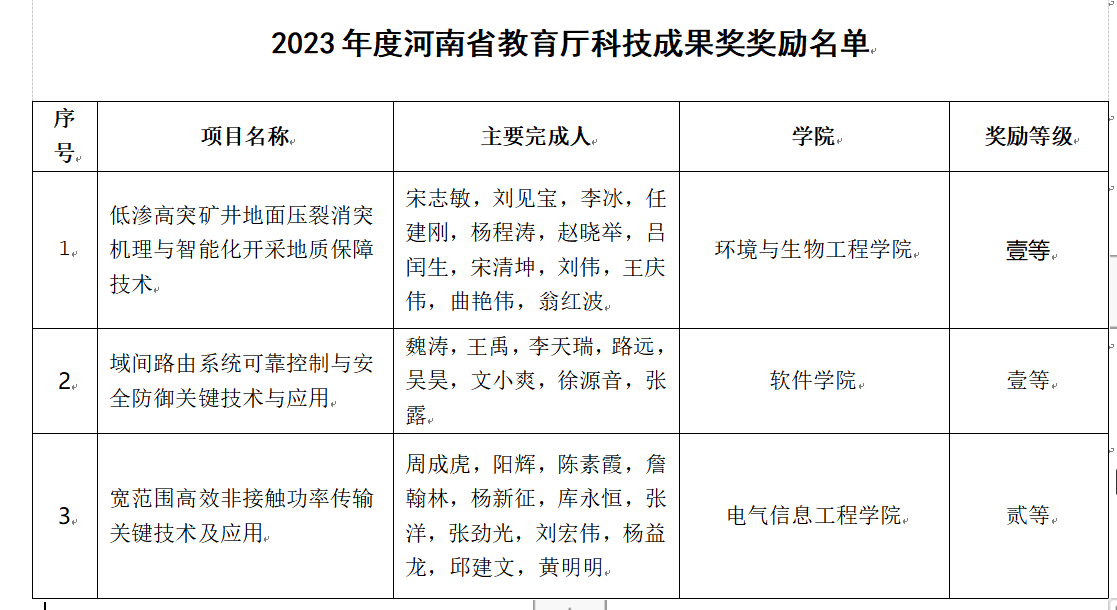 近日,河南省教育厅印发《关于公布2023年度科技成果奖奖励名单的通知》(教科技〔2023〕185号),公布2023年度科技成果奖和优秀科技论文奖获奖名单,beat365官网2项成果荣获河南省教育厅科技成果奖一等奖,1项成果荣获河南省教育厅科技成果奖二等奖; 6篇论文荣获河南省教育厅优秀科技论文奖一等奖, 14篇论文荣获河南省教育厅优秀科技论文奖二等奖。