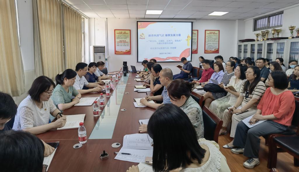 为推进学习贯彻习近平新时代中国特色社会主义思想主题教育走深走实,坚持不懈推进全面从严治党纵深发展,持之以恒抓好作风建设,6月14日下午,机关党委党群三党支部与外语学院党委联合开展支部1+1活动暨“明方向、立规矩、正风气、强免疫”专题纪律教育党课学习,校纪委书记、监察专员李德耀作“涵养风清气正 凝聚发展力量”专题党课。机关党委党群三党支部与外语学院全体教职工及学生党员代表聆听报告。