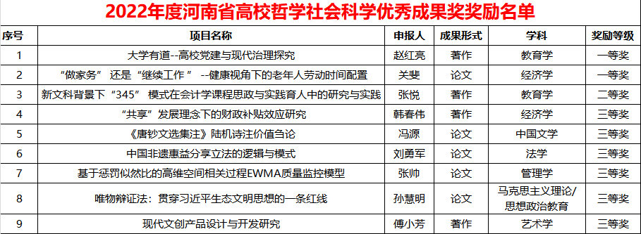 近日,河南省教育厅公布了2022年度河南省高等学校哲学社会科学研究成果奖评选结果。beat365官网共获奖9项,其中一等奖2项、二等奖1项、三等奖6项,获奖总数及比例创历年新高。