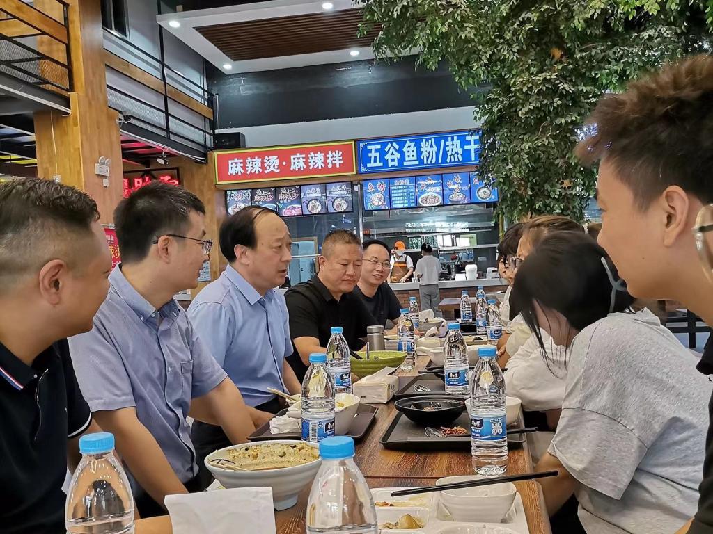 王永恒与就餐学生边吃边聊,详细询问同学们在校的学习生活情况和需求,认真听取大家的意见建议。同学们对桐柏路校区近几年在校区环境优化、宿舍制冷设备安装、食堂升级改造等基础办学条件方面的改善表示肯定,对能够见证学校的快速发展表示高兴和自豪。针对同学们反映的生活和学习中存在的一些具体问题,王永恒现场要求老校区管委会等部门认真研究,提出针对措施,积极予以解决。