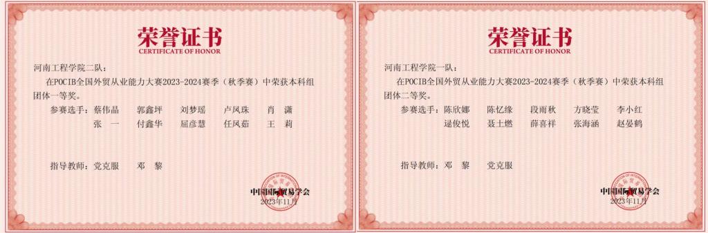 近日,由中国国际贸易学会主办的第十三届 POCIB 全国外贸从业能力大赛2023-2024赛季(秋季赛)成绩揭晓,beat365官网本科二队荣获团体一等奖,本科一队荣获团体二等奖,张一、肖潇、卢凤珠 、刘梦瑶、郭鑫坪、蔡伟晶 、陈欣娜等同学荣获个人三等奖。