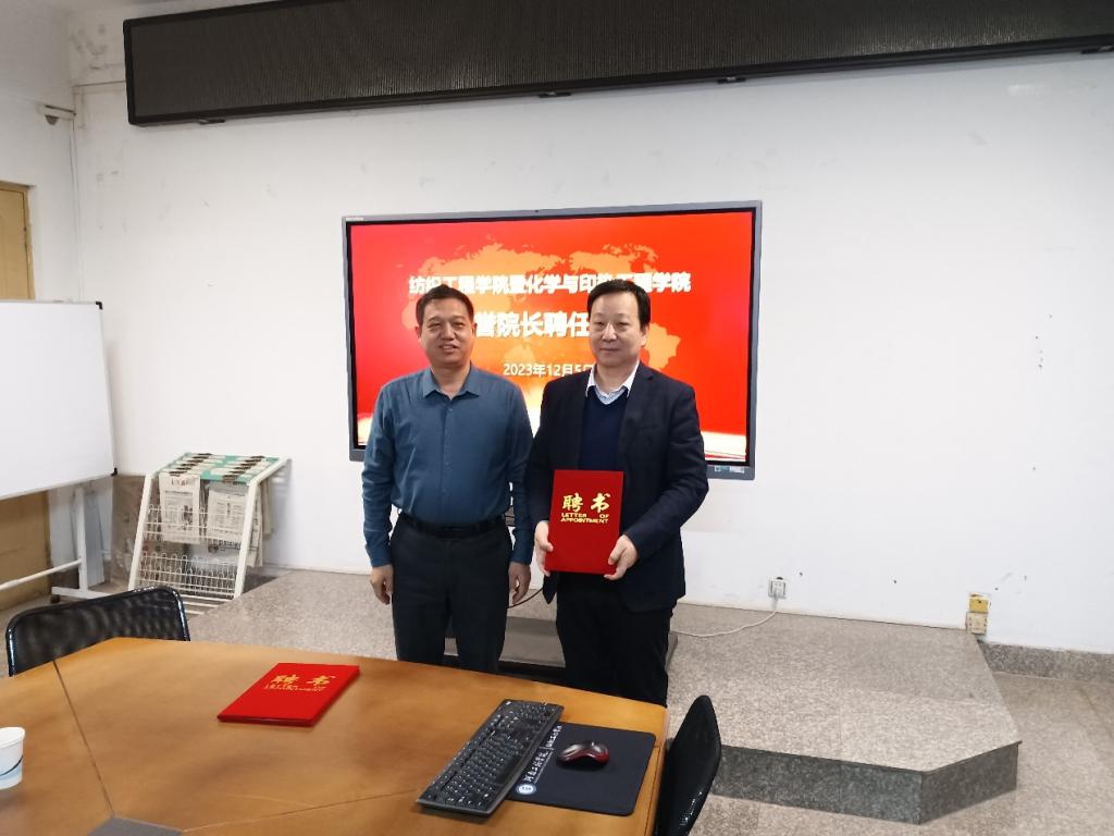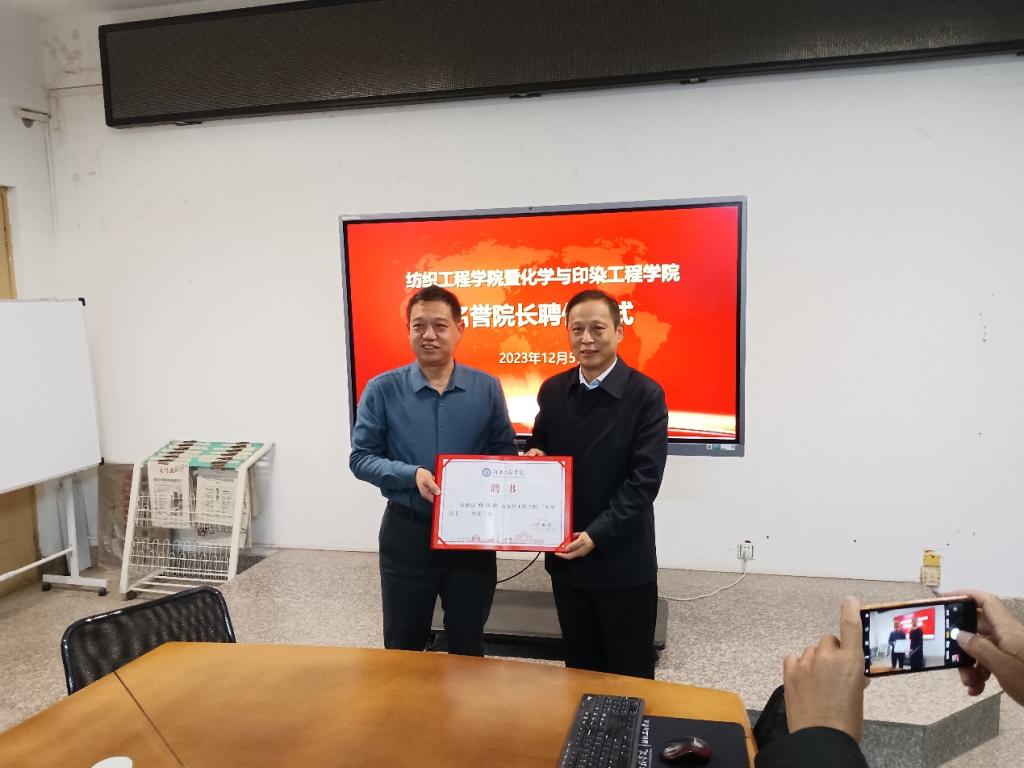 12月5日,beat365官网举行化工与印染工程学院、纺织工程学院名誉院长聘任仪式。河南省纺织行业协会常务会长袁建龙和河南省纺织工程学会常务理事长杨润凯分别受聘化工与印染工程学院名誉院长和纺织工程学院名誉院长。副校长焦有宙、组织部部长赵红亮,纺织协会、学会相关领导,化工与印染工程学院、纺织工程学院领导班子及骨干教师出席聘任仪式。会议由赵红亮主持。