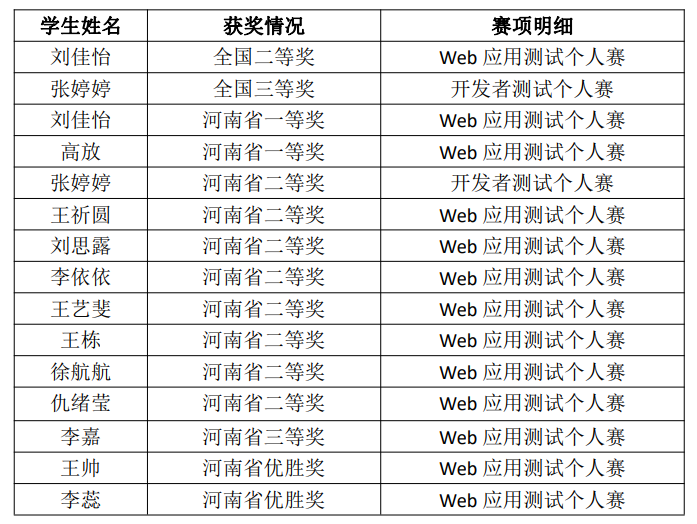 近日,第八届全国大学生软件测试大赛河南省赛及国赛落下帷幕,软件学院首次代表学校参赛并喜获佳绩,获奖总计15项,其中全国二等奖1项,全国三等奖1项,河南省一等奖2项,河南省二等奖8项,河南省三等奖1项,河南省优胜奖2项。