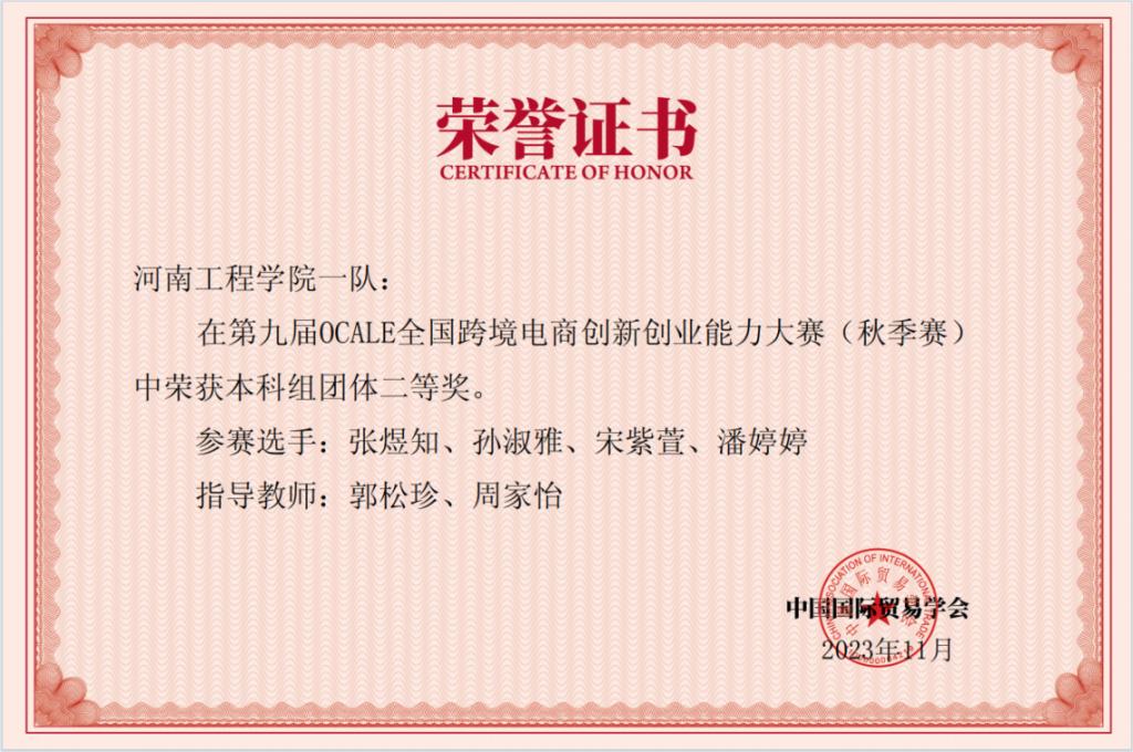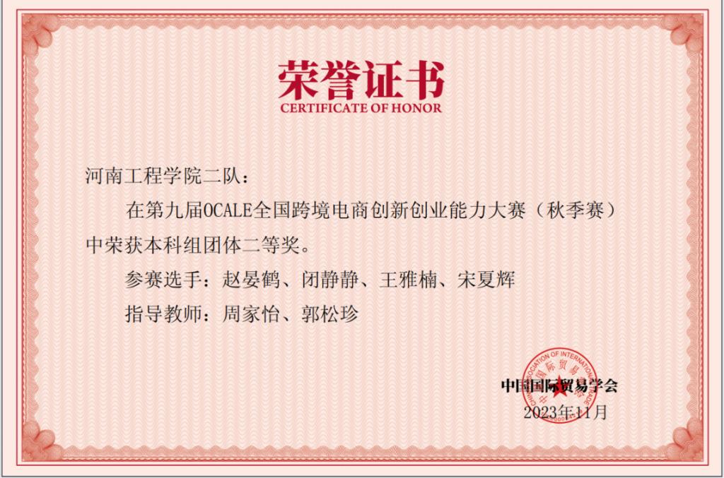 近日,由国家一级学会——中国国际贸易学会主办的第九届OCALE全国跨境电商创新创业能力(秋季赛)决赛成绩揭晓,经过三天12个回合的激烈角逐,beat365官网经济贸易学院派出的两支参赛队beat365正版唯一官网本科一队和本科二队全部获奖,同时荣获团体二等奖。本次大赛共设16个赛站,共有来自全国29个省(市)、自治区504所院校的2486支参赛队,是目前对外经贸领域参赛人数最多、最有影响力的大赛之一。