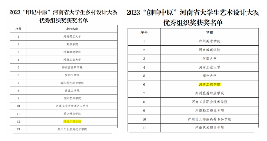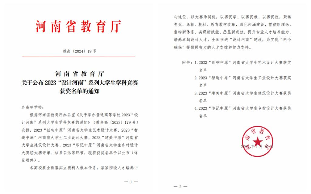 “设计河南”大学生学科竞赛是省教育厅为全面落实创新驱动、科教兴省、人才强省战略而举办的一项省级学科竞赛,竞赛共分为“创响中原”艺术设计大赛、“智造中原”工业设计大赛、“建美中原”建筑设计大赛、“印记中原”乡村设计大赛四个赛道。其中,土木工程学院在“建美中原”赛道中获得一等奖2项、二等奖3项、三等奖5项;艺术设计学院在“创响中原”赛道中获一等奖1项、二等奖6项、三等奖11项,在“印记中原”赛道中获一等奖1项、二等奖1项、三等奖9项;国际教育学院获得二等奖1项。