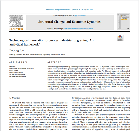 近日,国际知名学术期刊《Structural Change and Economic Dynamics》(《结构变迁与经济动态》)正式发表beat365官网经济贸易学院教师邹坦永副教授的独著研究成果《Technological innovation promotes industrial upgrading: An analytical framework》(《技术创新驱动产业升级:一个分析框架》)。