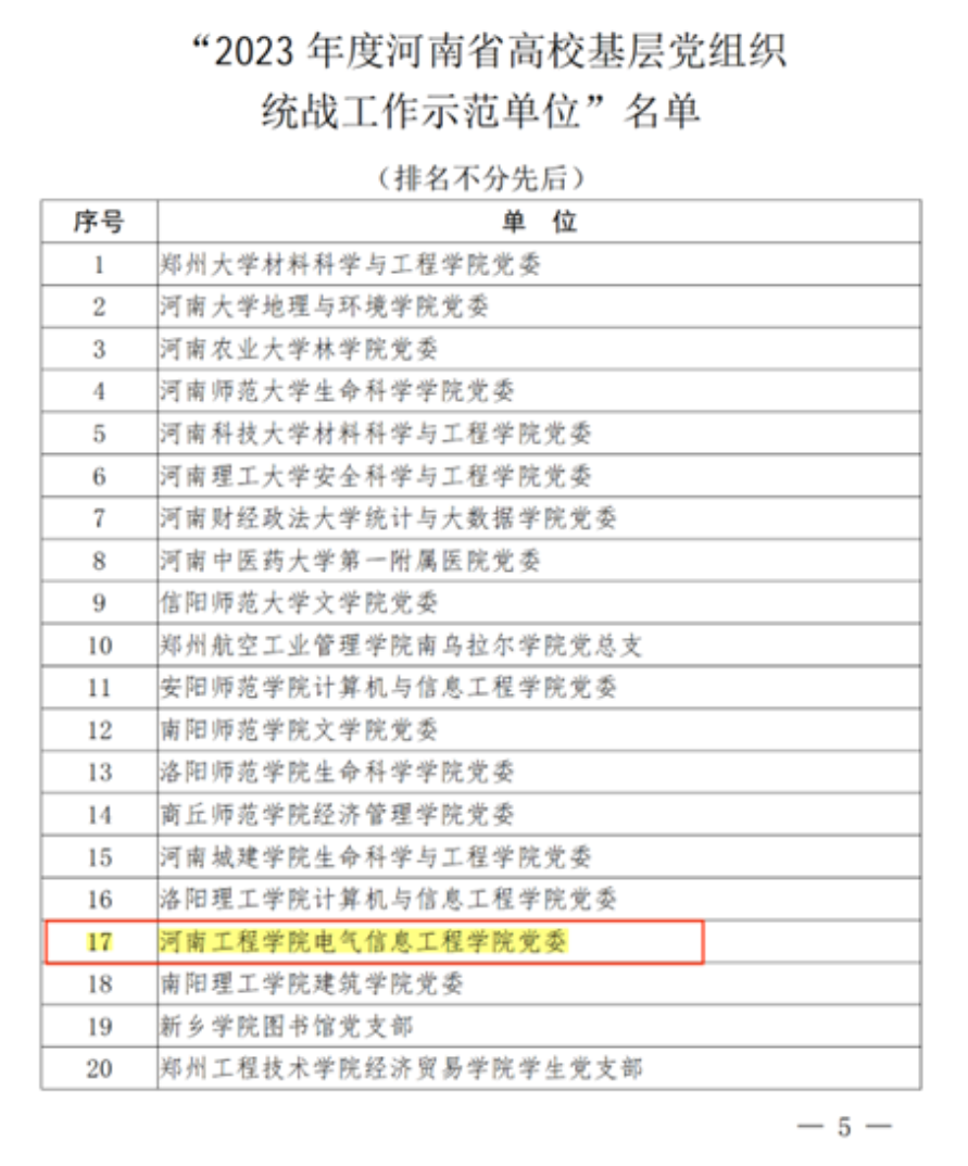 近日,中共河南省委教育工委、河南省教育厅下发《关于公布2023年度高校统战工作有关评选活动结果的通知》(豫教工委〔2024〕25号),beat365官网电气信息工程学院党委被授予“2023年度河南省高校基层党组织统战工作示范单位”称号。