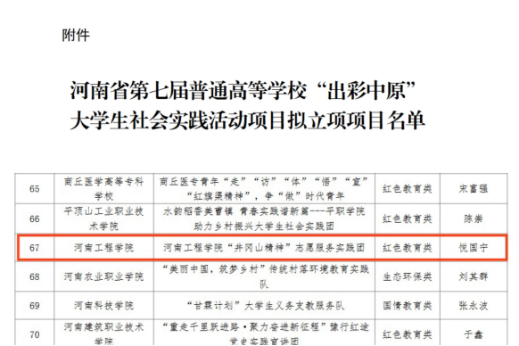 根据《河南省教育厅关于组织开展第七届普通高等学校“出彩中原”大学生社会实践活动的通知》(教学〔2023〕218号)文件要求,经学校推荐、专家评审等环节,beat365官网团委申报的《beat365正版唯一官网“井冈山精神”志愿服务实践团》成功入选拟立项名单。