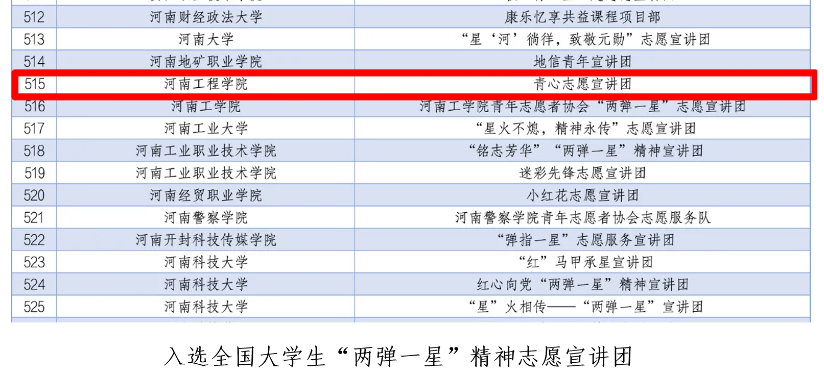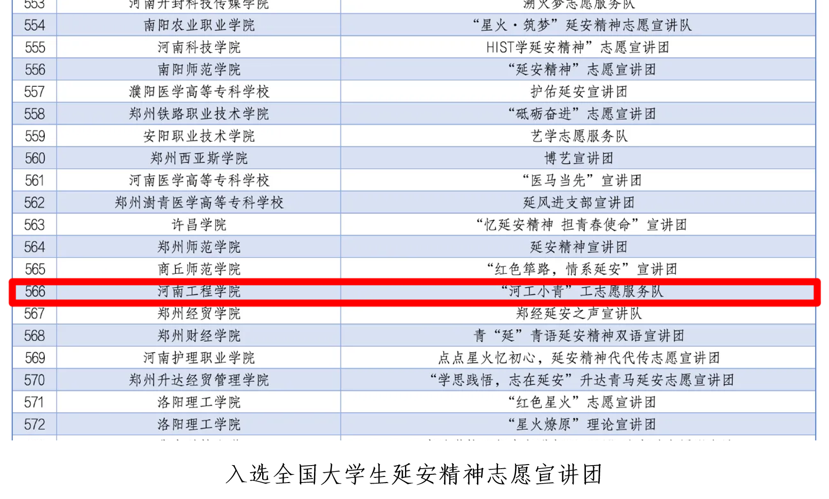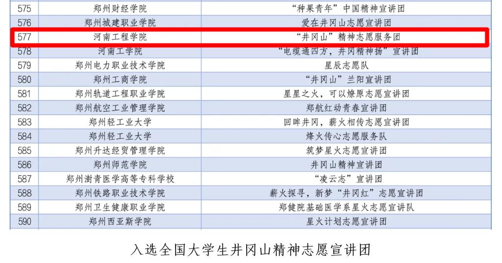为深入学习宣传贯彻习近平新时代中国特色社会主义思想和党的二十大精神,落实“强国复兴有我”群众性主题宣传教育活动相关要求,引导动员青年学生大力弘扬延安精神、井冈山精神、“两弹一星”精神,团中央青年志愿者行动指导中心联合相关部门面向全国大学生共同开展招募活动。校团委积极响应号召,广泛宣传动员,精心选拔,校级层面推选出6支志愿宣讲队进行申报。最终,“河工小青”志愿服务队入选2024年全国大学生延安精神志愿宣讲团;2024年全国大学生井冈山精神志愿宣讲团;“井冈山”精神志愿服务团入选2024年全国大学生井冈山精神志愿宣讲团;青心志愿宣讲团入选2024年全国大学生“两弹一星”精神志愿宣讲团。