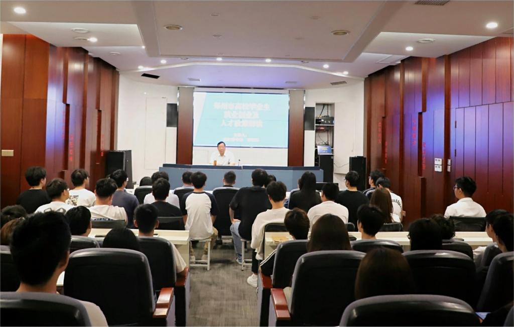 李德耀以“郑州市就业政策解读”为题,围绕郑州基本情况、当前就业形势、就业创业政策和人才政策等方面,对郑州市的市情、就业状况和人才引进政策进行了详细讲解和阐释。他倡导大家要保持正确的就业认知,怀揣积极的就业心态,拥有坚定的意志品质,树立正确的就业观念,切勿消极应对、好高骛远、急于求成,要先就业后择业、早思考、早谋划、早就业,早日实现人生目标。一组组生动真实的数据、深入浅出的讲解使学生很受触动和启发,对学生了解和制定就业创业发展规划具有很好的指导意义。