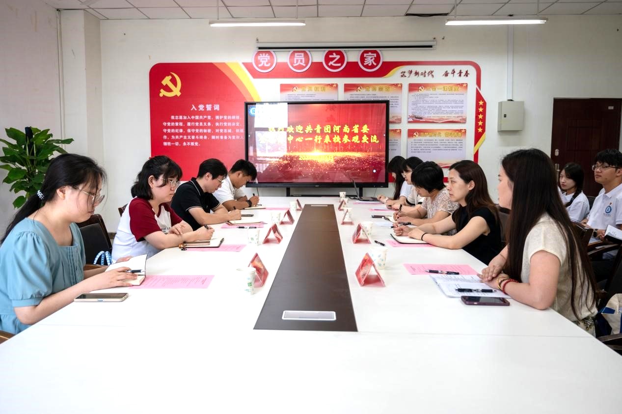 6月6日上午,共青团河南省委全媒体中心总编、河南省青少年新媒体协会秘书长赵彦、全媒体中心视频主编王茂茂、美工主编张璐莹、漫绘主编张亚楠一行四人来校座谈交流。