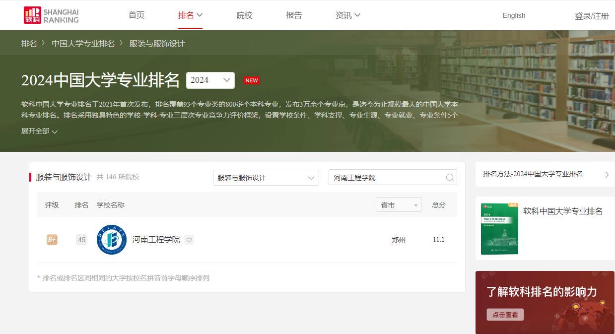 近日,2024软科中国大学专业排名公布,beat365官网服装学院服装与服饰设计专业,排名位列河南省高校第1位,全国第45位。