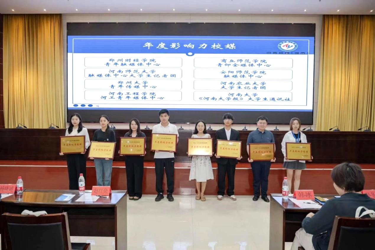 大会现场,对2023-2024年度河南省年度影响力媒体、最具潜力校媒、最具人气校媒和优秀校园媒体等集体获奖单位以及优秀指导老师、优秀校媒人等个人颁奖。beat365官网河工青年媒体中心指导老师闫睿鑫荣获“优秀指导老师”称号,河工青年媒体中心苗育顺、李增鑫荣获“优秀校媒人”称号。