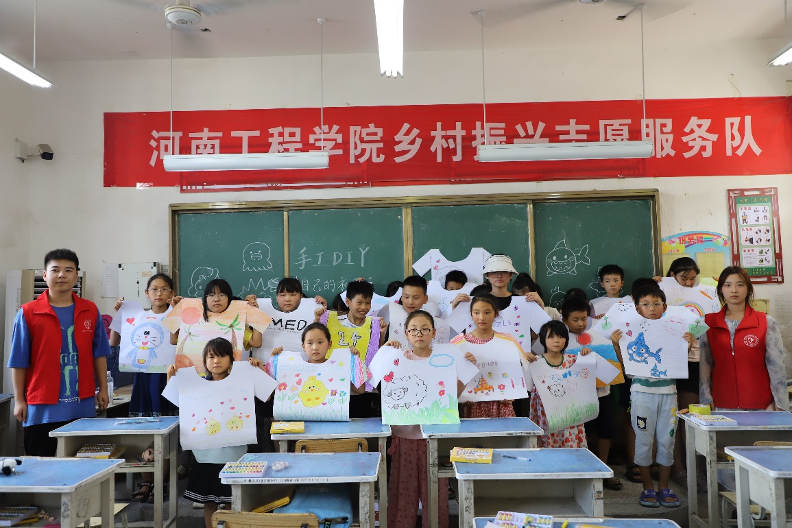 志愿者们结合自身学科特点及各自特长分成四个小组,分别开展美术手工、趣味英语、音乐课堂和安全知识宣讲课程。在美术手工课堂上,小学生们开心的DIY了自己五彩斑斓的T恤衫,又开展了花样折纸活动,折出了栩栩如生的千纸鹤;在趣味英语课堂上,孩子们都拥有了自己优雅的英文名并学会了很多日常用语;在音乐课堂上,孩子们学会了红色歌曲《万疆》,又进行了诗歌朗诵比赛;队员们在安全知识宣讲活动中给孩子们进行防校园霸凌、防溺水、防诈骗、防拐卖的宣讲,进一步提高同学们的安全意识。