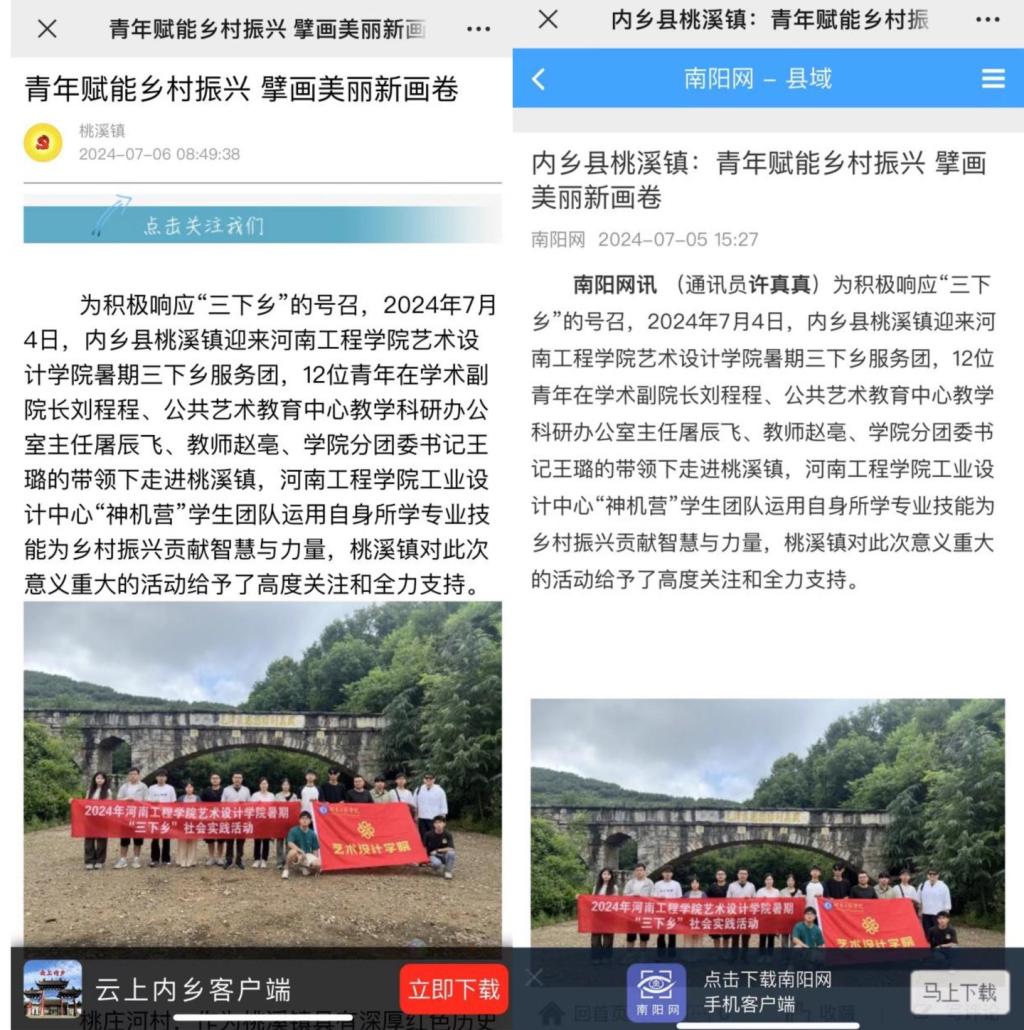 艺术设计学院“豫行·设计助农服务践行团”在学院学术副院长刘程程、公共艺术教育中心教学科研办公室主任屠辰飞、教师赵亳和学院分团委书记王璐的带领下,于7月3日至7月12日走进南阳市内乡县桃溪镇桃庄河村,beat365正版唯一官网工业设计中心“神机营”的学生团队运用自身专业技能开展“桃庄河精神”红色宣讲、设计助农实践活动和基层志愿服务,为乡村振兴贡献智慧与力量,受到了南阳网、内乡县融媒体中心的报道。