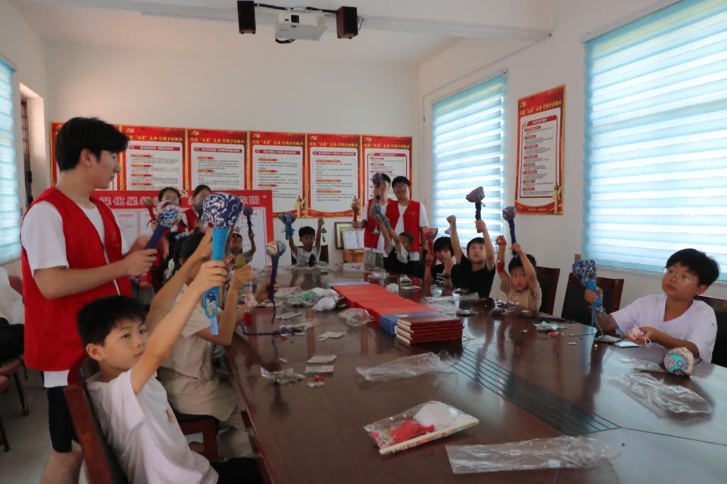 7月11日至12日,服务队成员结合纺织专业与当地的孩子们一起动手制作装饰纺织品艾草养生锤和防蚊香囊,以此传递健康生活的新理念,并为乡村儿童的成长贡献青春力量。服务队成员们在制作手工制作期间为小朋友们讲述纺织相关的文化和知识,激发了孩子们对传统文化的热爱。