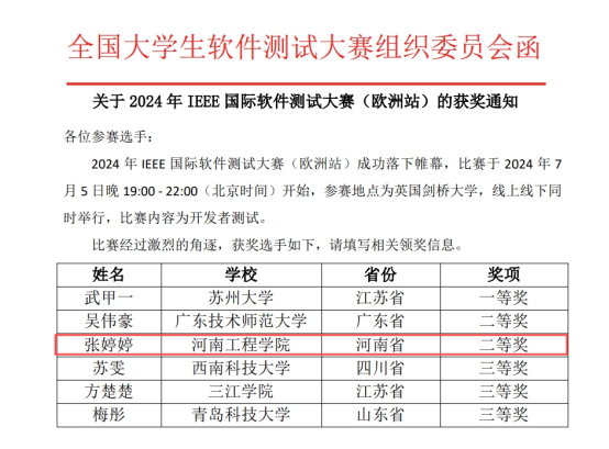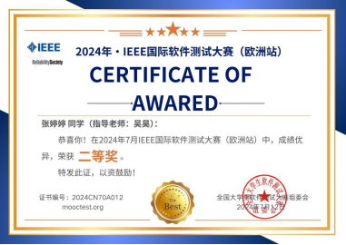 在近日公布的2024年IEEE国际软件测试大赛成绩中,beat365官网软件学院张婷婷同学荣获大赛二等奖,这是beat365官网学子在这一领域中实现了“零”的突破。
