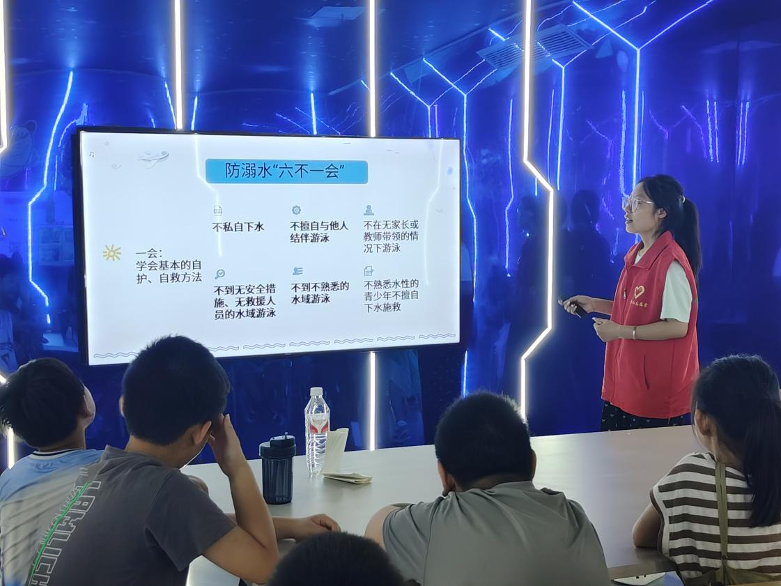 为进一步提升青少年安全意识,有效预防暑期溺水事故发生,志愿者们为孩子们开设了“暑期安全知识”小课堂,从预防溺水“六不准”“四牢记”、预防溺水的措施、溺水自救的方法、他人溺水营救的方法四个方面,通过领读与问答的方式,以及通俗易懂的语言和动画展示向孩子们详细讲解了预防溺水相关知识和技巧,让孩子们牢记防溺水安全知识。进一步提高了少年儿童自救与互救的素质和能力。