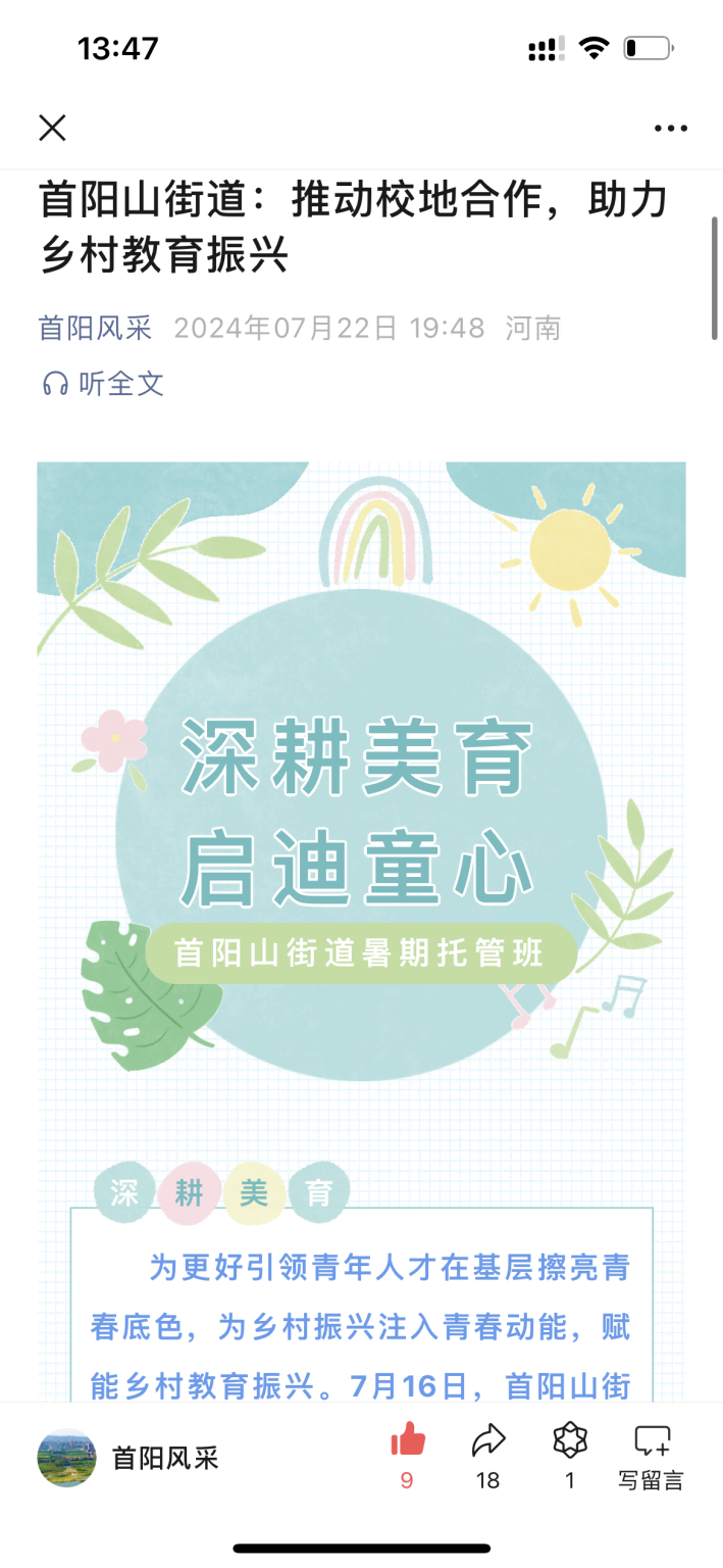 志愿者师生的到来不仅丰富了大冢头村孩子们的暑假生活,也为孩子们打开了一扇了解艺术的窗户,同时通过红色宣讲、美育宣传、文化宣扬的形式助力乡村振兴,得到了家长和孩子们的高度喜爱和认可,我们也将持续推进乡村美育浸润行动,让青春在基层绽放,用艺术助力乡村振兴,用实际行动诠释当代大学生的社会责任感和服务精神,让美育之花在乡村绚烂绽放!