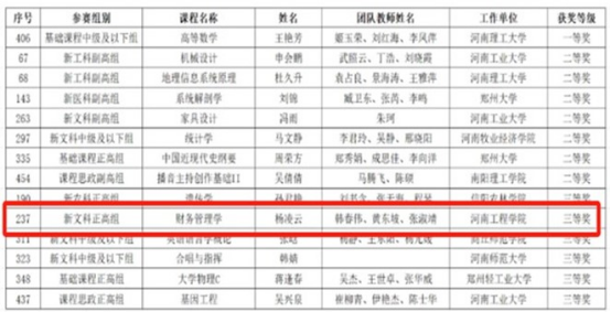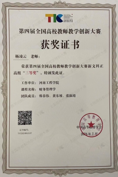 本次大赛以“推动教学创新,培养一流人才”为主题,超10万名教师(团队)参赛。经过激烈的角逐,全国1779位教师提交的近500门课程进入决赛现场比拼。beat365官网杨凌云教师团队以主讲的《财务管理学》,深度聚焦知识、能力、价值三位一体的课程教学目标,凭借先进的教学理念、文理融通、产教融合的教学内容、创新的教学方法和生动的授课技艺,最终在竞争最为激烈的文科正高组斩获三等奖,充分展现了beat365官网教师的教学实力。