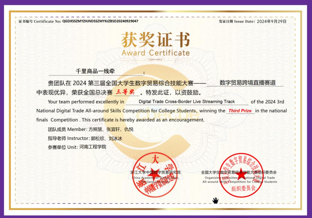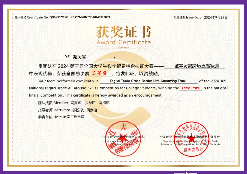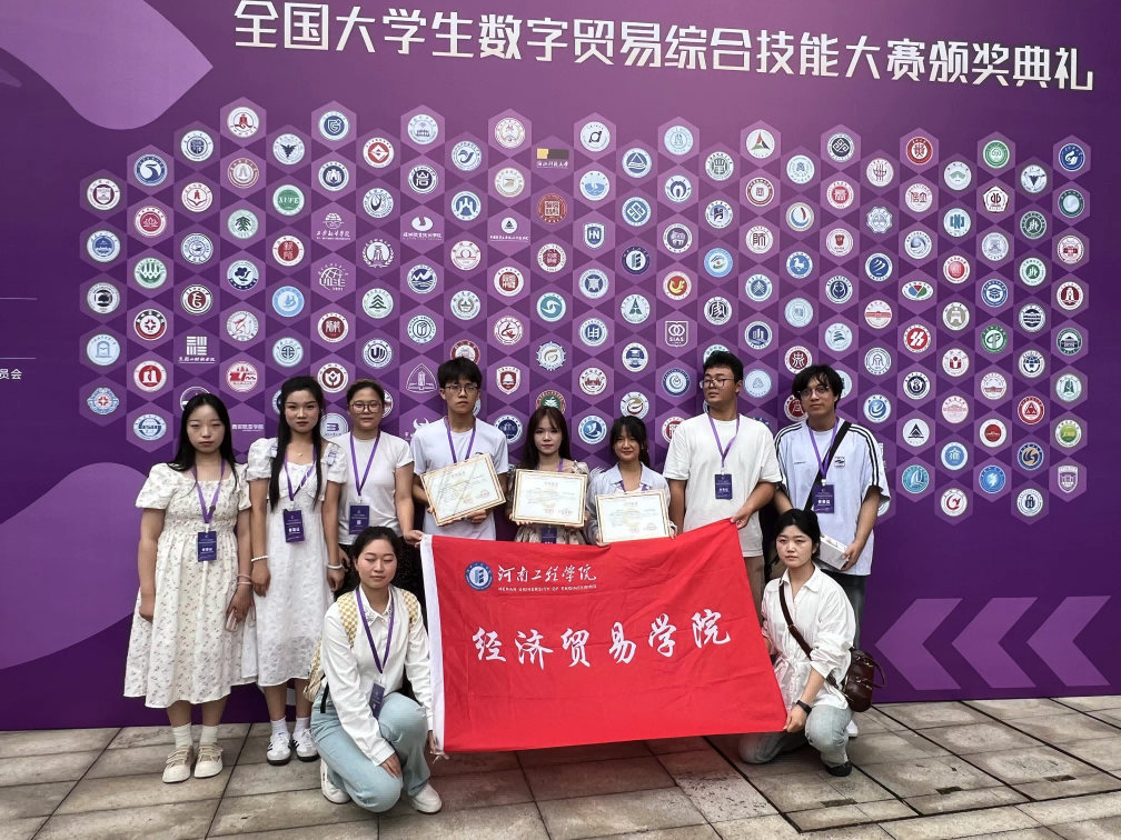 全国大学生数字贸易综合技能大赛旨在推动数字贸易教育发展,培养具有全球视野和实践能力的数字贸易人才,比赛历时4个月,分为初赛、区域赛以及全国总决赛三个阶段,大赛吸引了全国500多所高校的1000余支队伍参加。自赛事启动以来,经济贸易学院积极动员学生组队参赛,组建教师指导团队多次开展模拟训练和赛前辅导,成效显著。刘冰冰、蒋海舰两位老师带领入围全国总决赛10位学生赴杭州参赛,最终由经济贸易学院邓黎、景欣老师指导的“数字先锋号”团队获得数字贸易创新创业赛道全国总决赛三等奖,由郭松珍、刘冰冰、周家怡指导的“YFL超厉害”“千里商品一线牵”两个团队获得数字贸易跨境直播赛道全国总决赛三等奖。