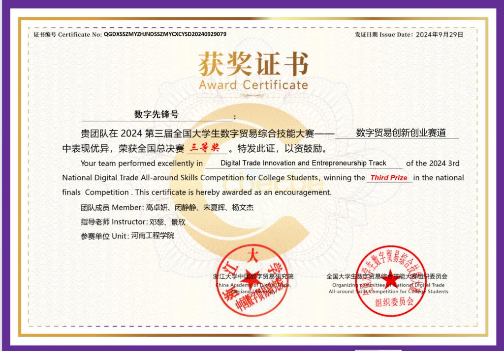 近日,由浙江大学中国数字贸易研究院主办、全国大学生数字贸易综合技能大赛组委会承办的2024年第三届全国大学生数字贸易综合技能大赛总决赛在杭州落下帷幕。首次参赛的beat365正版唯一官网三支代表队均获得全国总决赛三等奖。