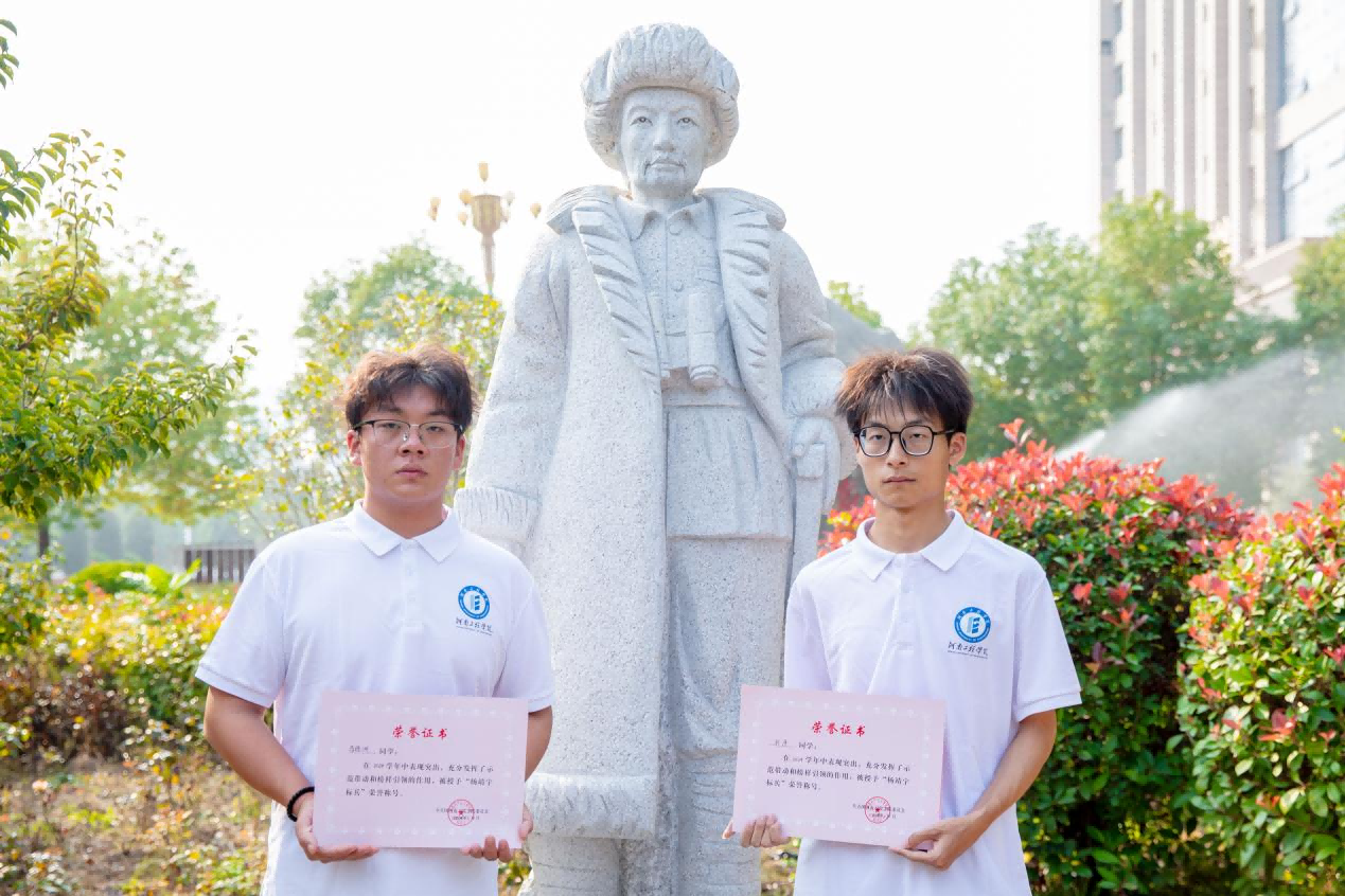 为表彰先进,学校决定授予马绿洲、刘洋两位同学“靖宇标兵”荣誉称号,赵红亮为其颁发了荣誉证书。