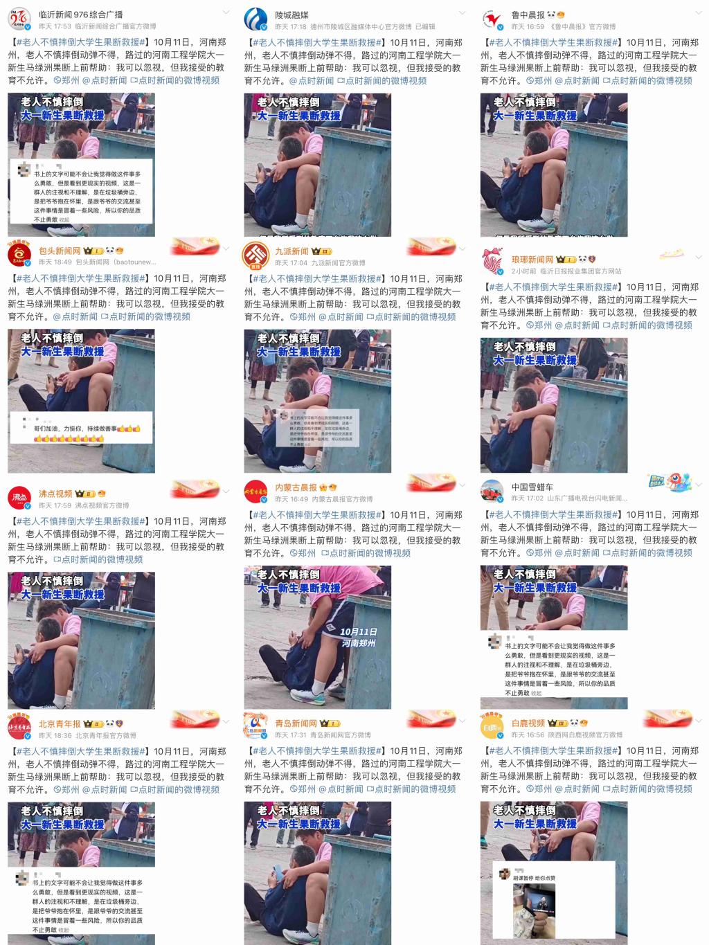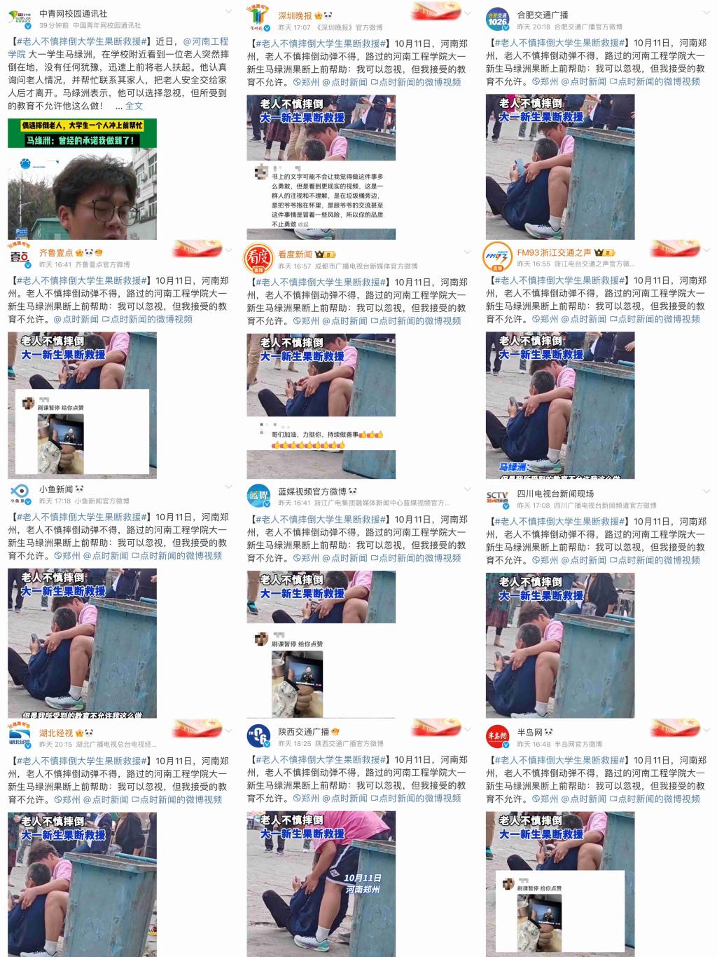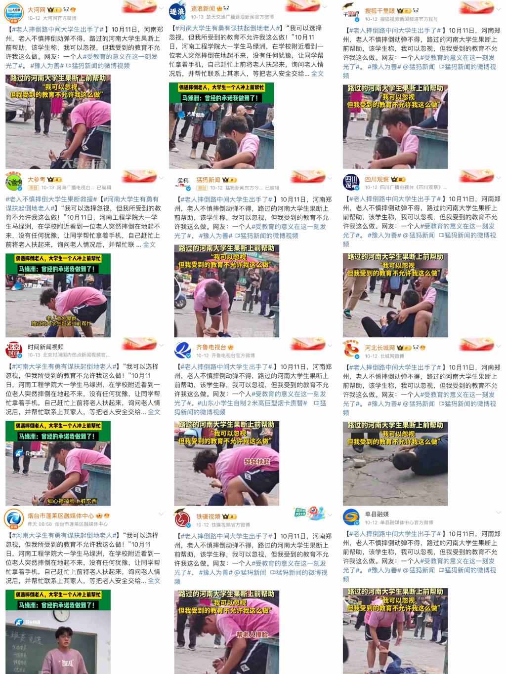 10月11日下午,beat365官网电气信息工程学院软件工程(智能物联)2444班大一新生马绿洲与刘洋,在外出购物的途中偶遇一位老人不慎摔倒,马绿洲同学上前搀扶起老人,细心地帮助老人擦去脸上的脏东西,并帮助老人联系了家属。两位同学一直细心照料老人,直到老人家属到来,看到老人平安回家才放心离开。这一温馨而充满正能量的场景,被同伴拍摄并发布在社交平台,随即在网络上迅速传播开来,引发了广大网友的深切关注与高度赞扬。50多家省内外媒体进行了报道,全网阅读量超2600万次,点赞数破百万。抖音平台#老人不慎摔倒大学生果断暖心救助#话题,10月13日登上抖音同城热榜第一位;微博平台#受教育意义在这一刻发光了#话题,10月13日登上微博同城热搜第二位。