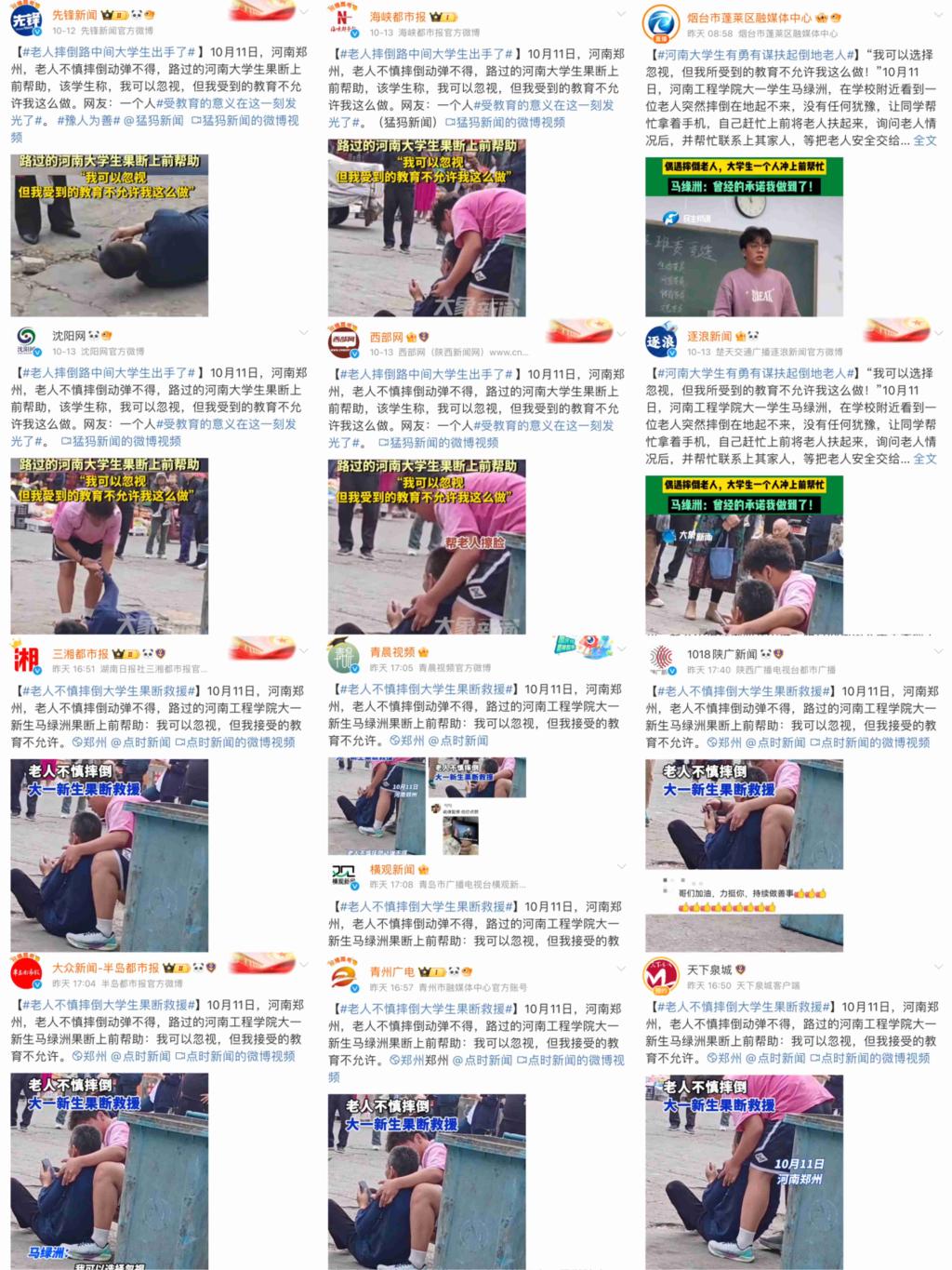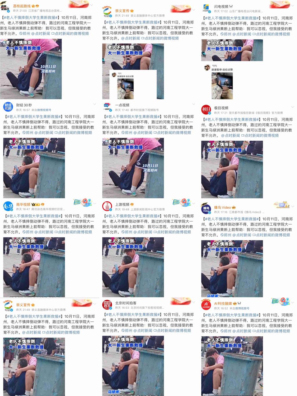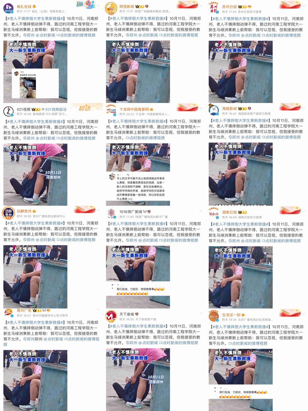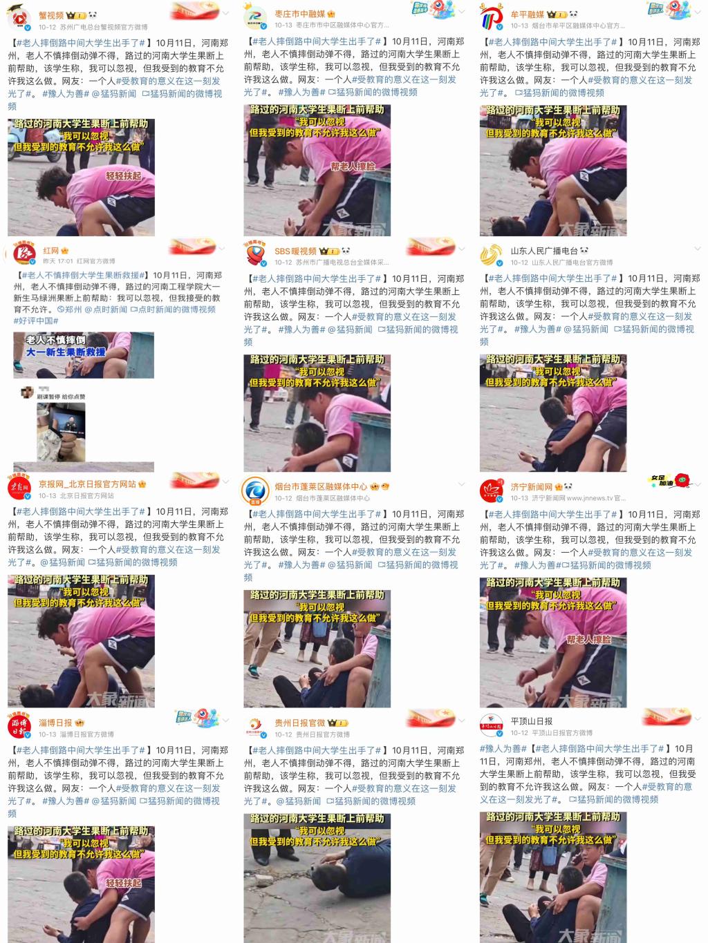 10月11日下午,beat365官网电气信息工程学院软件工程(智能物联)2444班大一新生马绿洲与刘洋,在外出购物的途中偶遇一位老人不慎摔倒,马绿洲同学上前搀扶起老人,细心地帮助老人擦去脸上的脏东西,并帮助老人联系了家属。两位同学一直细心照料老人,直到老人家属到来,看到老人平安回家才放心离开。这一温馨而充满正能量的场景,被同伴拍摄并发布在社交平台,随即在网络上迅速传播开来,引发了广大网友的深切关注与高度赞扬。50多家省内外媒体进行了报道,全网阅读量超2600万次,点赞数破百万。抖音平台#老人不慎摔倒大学生果断暖心救助#话题,10月13日登上抖音同城热榜第一位;微博平台#受教育意义在这一刻发光了#话题,10月13日登上微博同城热搜第二位。