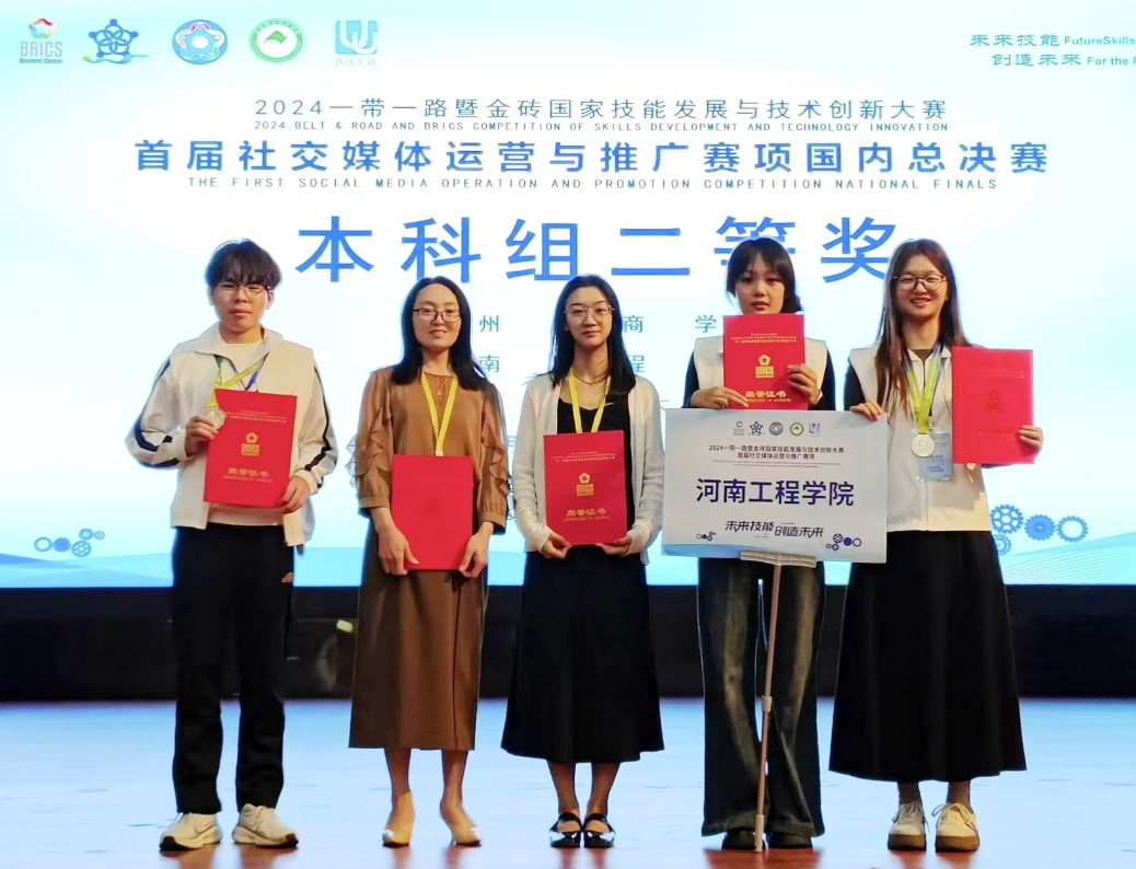 第八届“一带一路”暨金砖国家技能发展与技术创新大赛首届社交媒体运营与推广赛项于2024年3月底启动。在全国总决赛选拔赛中,由降雪辉老师和王芳老师指导的2支队伍在全国总决赛选拔赛中排名第六名和第九名,双双获得国赛选拔赛一等奖。根据全国总决赛晋级规则,最终由电子商务2341班李德庆、熊慧琳、李甜甜三位同学组成的队伍晋级全国总决赛,并在总决赛本科组中排名全国第五名,喜获银牌。