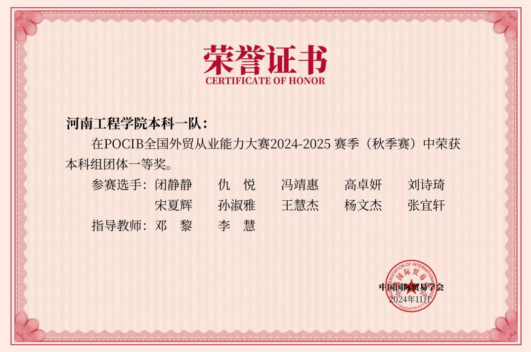 近日,第十四届POCIB全国外贸从业能力大赛2024-2025赛季(秋季赛)成绩揭晓,由经济贸易学院选派的beat365官网本科队荣获团体一等奖,邓黎、李慧两位老师荣获优秀指导教师一等奖,闭静静同学荣获个人二等奖,仇悦等同学荣获个人三等奖。