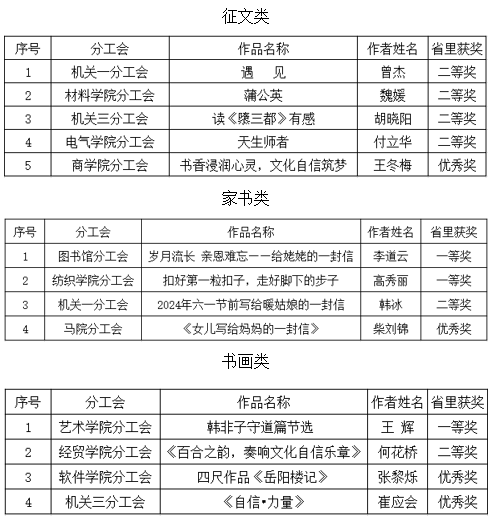 校工会开展了以“坚定文化自信•激扬奋进力量”为主题的“书香三八”读书活动,学校各分工会精心组织、广泛动员,广大女教职工积极参与,共收集到各类作品175件,其中征文类作品53篇、家书类作品64篇、书画类作品58件。本次读书活动激励了广大女职工坚定理想信念,立足岗位、奋力拼搏,为推进中国式现代化建设河南实践、谱写新时代新征程中原更加出彩的绚丽篇章凝聚强大精神力量。