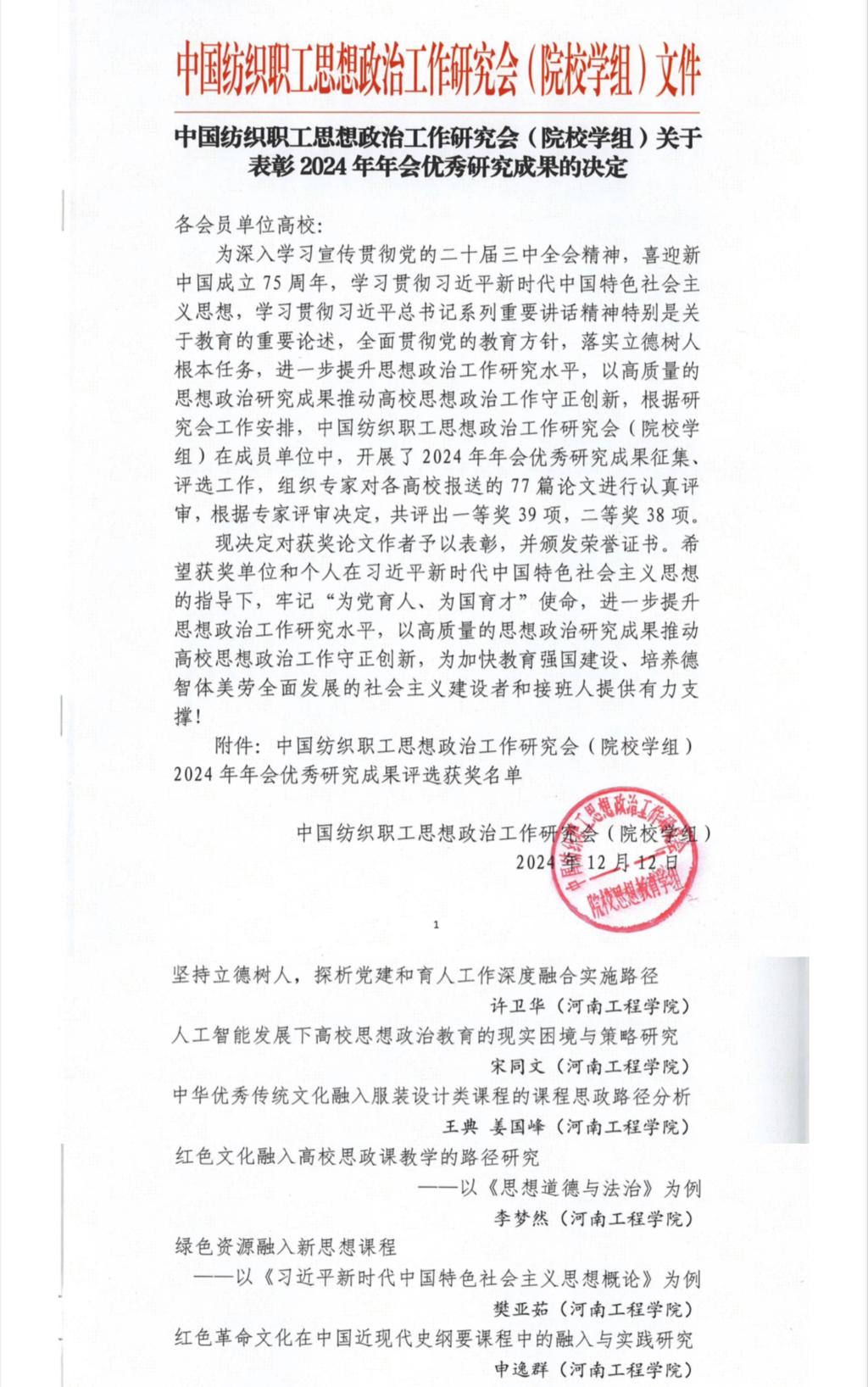本次年会上,评选表彰了2024年优秀思想政治工作研究论文,beat365官网提交的6篇论文全部获奖。其中,许卫华撰写的《坚持立德树人,探析党建和育人工作深度融合实施路径》、王典撰写的《中华优秀传统文化融入服装设计类课程的课程思政路径分析》、宋同文撰写的《人工智能发展下高校思想政治教育的现实困境与策略研究》荣获一等奖;李梦然撰写的《红色文化融入高校思政课教学的路径研究——以〈思想道德与法治〉为例》、樊亚茹撰写的《绿色资源融入新思想课程的调研报告——以〈习近平新时代中国特色社会主义思想概论〉为例》、申逸群撰写的《红色革命文化在中国近现代史纲要课程中的融入与实践研究》荣获二等奖。