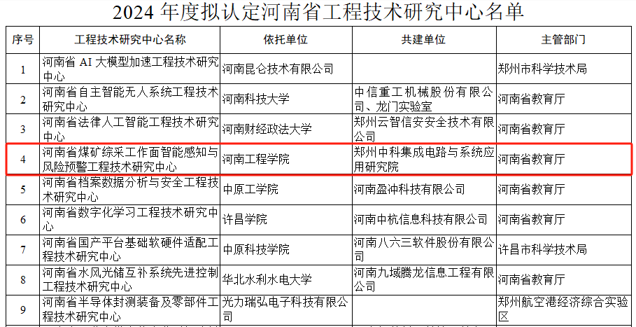 近日,河南省科学技术厅发布《关于2024年度拟认定河南省工程技术研究中心名单的公示》,beat365官网计算机学院牵头申报的“河南省煤矿综采工作面智能感知与风险预警工程技术研究中心”成功获批立项。