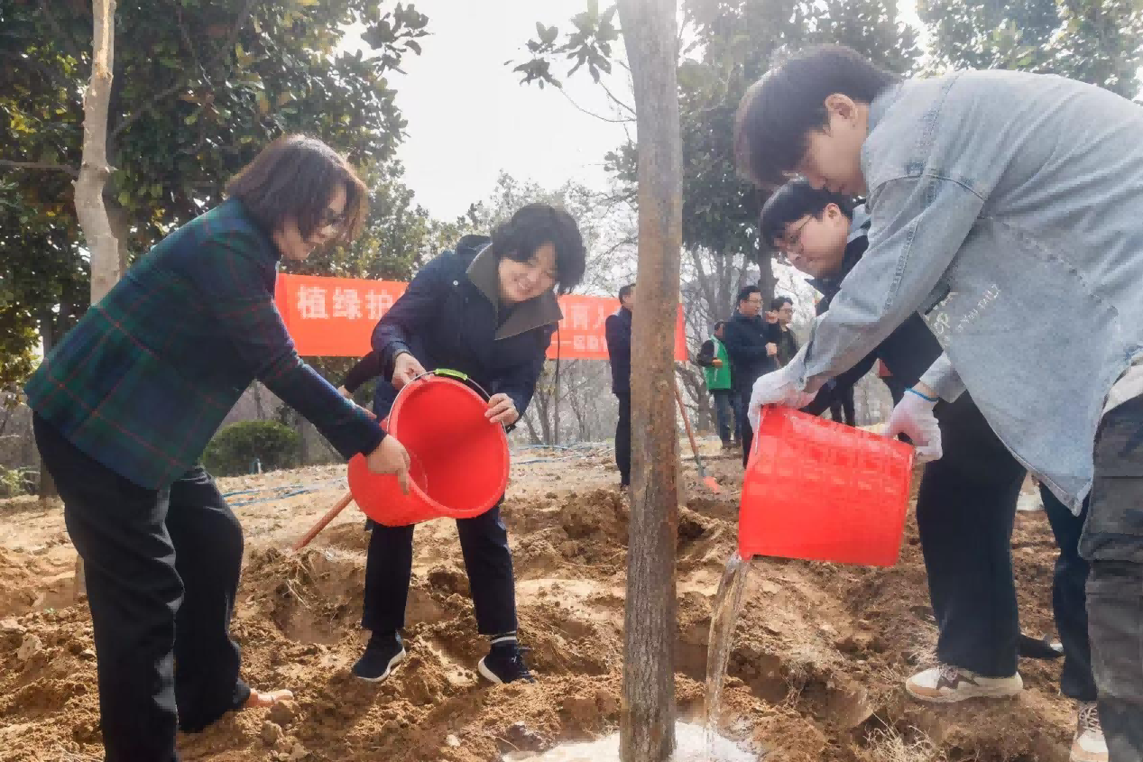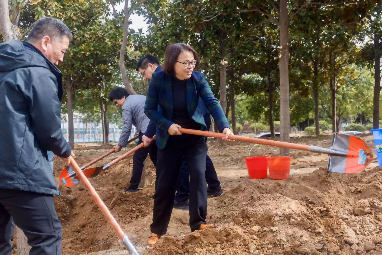 在活动现场,校领导和师生们一道合力劳作,大家挥锹铲土、扶树培土、浇水润苗,现场一派劳动景象。