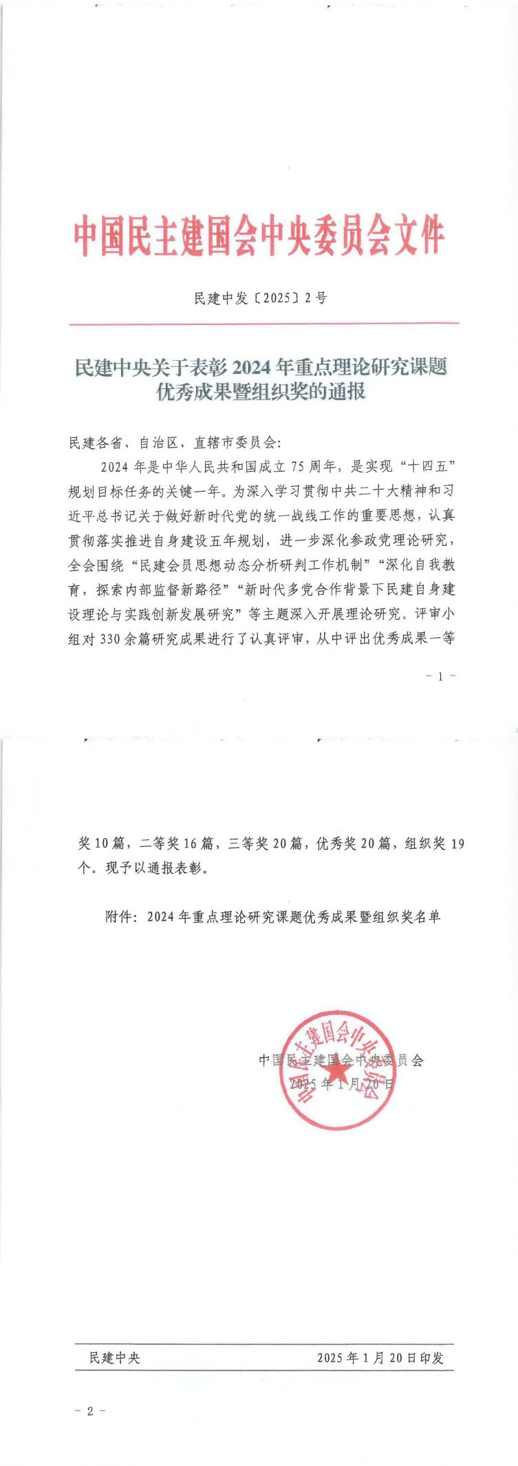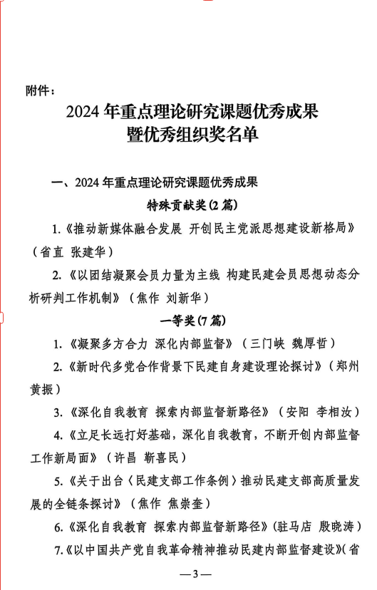 近日,民建中央下发《关于表彰2024年重点理论研究课题优秀成果暨优秀组织奖的通报》,beat365官网经济贸易学院院长、新郑市人大代表、民建会员张建华教授撰写的《推动新媒体融合发展 开创民主党派思想建设新格局》被评为“2024年重点理论研究课题优秀成果二等奖”。同时该研究成果被评为民建河南省委会“2024年重点理论研究课题优秀成果特殊贡献奖”。