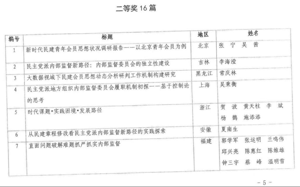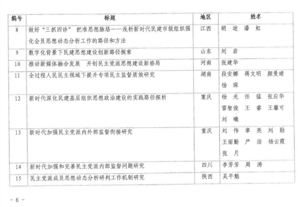 为深入学习贯彻习近平总书记关于做好新时代党的统一战线工作的重要思想,认真贯彻落实推进自身建设五年规划,进一步深化参政党理论研究,民建中央以“民建会员思想动态分析研判工作机制”“深化自我教育,探索内部监督新路径”“新时代多党合作背景下民建自身建设理论与实践创新发展研究”为主题在全会开展理论研究。民建中央评审小组对上报的330余篇研究成果进行了认真评审、表彰,评选出一等奖10篇,二等奖16篇,三等奖20篇,优秀奖20篇。