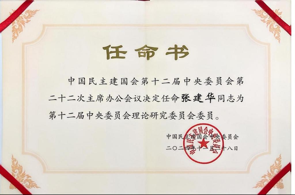 同时,张建华教授于2024年年底当选民建第十二届中央委员会理论研究委员会委员。