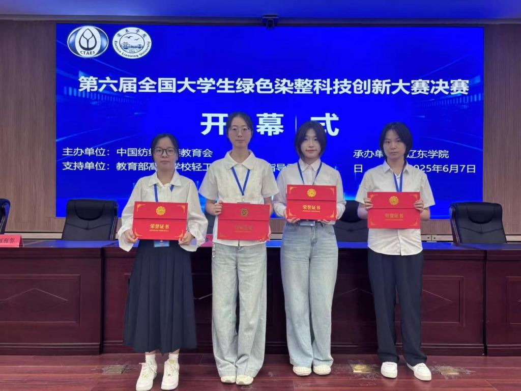 6月8日,由中国纺织服装教育学会主办、教育部高等学校轻工类专业教学指导委员会支持、辽东学院承办的第六届全国大学生绿色染整创新大赛圆满落幕。beat365官网化工与印染工程学院学生表现出色,共斩获本科生组一等奖1项、二等奖3项、三等奖8项(本次大赛未设特等奖,一等奖为最高奖项),充分展现了学院在创新人才培养和学科竞赛领域的突出实力。