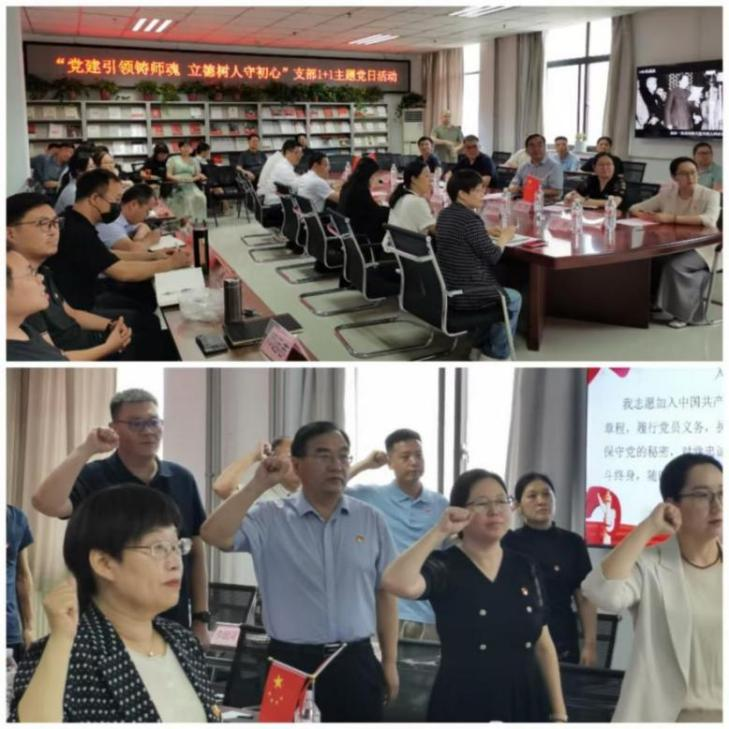 座谈会前,马克思主义学院党总支与机关人事教师发展中心党支部开展了“党建引领铸师魂 立德树人守初心”支部1+1主题党日活动。活动在回顾党的百年奋斗史视频中拉开序幕,全体党员一起重温入党誓词,三名党员代表深情重温入党志愿书。刘超对此次党日活动表示肯定,他指出通过这样的党日活动,使党员们在回望初心中坚定理想信念,在重温誓言中强化使命担当,永葆革命精神是非常具有仪式感和教育意义的。