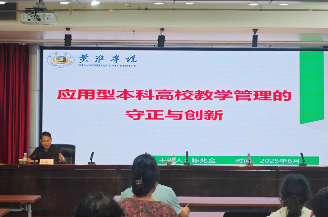 陈兆金结合黄淮学院教学管理做法,指出教学管理人员要具备学习力、定力和执行力,从“遵循教育规律 狠抓教学规范”“坚持学生中心 狠抓教学改革”“树立产出导向 狠抓教学建设”“加强持续改进 狠抓教学质量”四方面讲解如何提高教学管理人员的能力、提升教学管理质量。