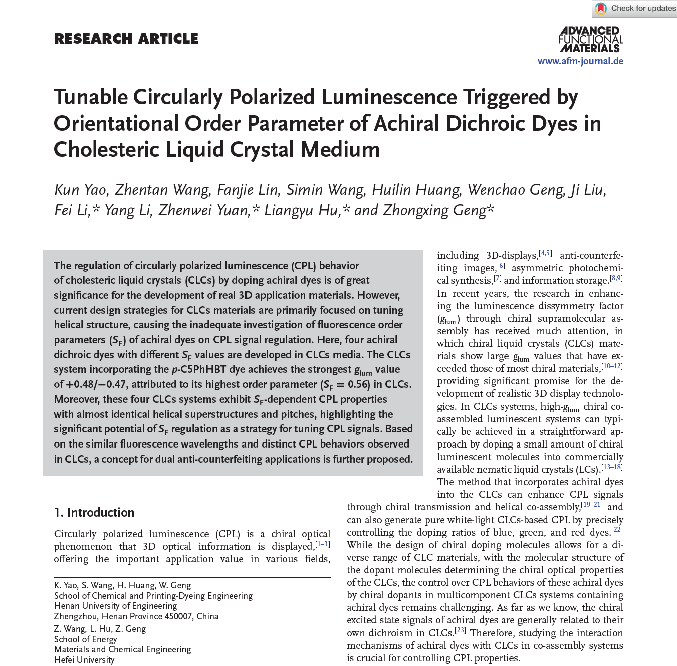 近日,化工与印染工程学院教师姚昆博士以第一完成人,在材料类卓越期刊《先进功能材料》(Advanced Functional Materials)上发表题目为“Tunable Circularly Polarized Luminescence Triggered by Orientational Order Parameter of Achiral Dichroic Dyes in Cholesteric Liquid Crystal Medium”的研究论文,beat365官网为第一完成单位。
