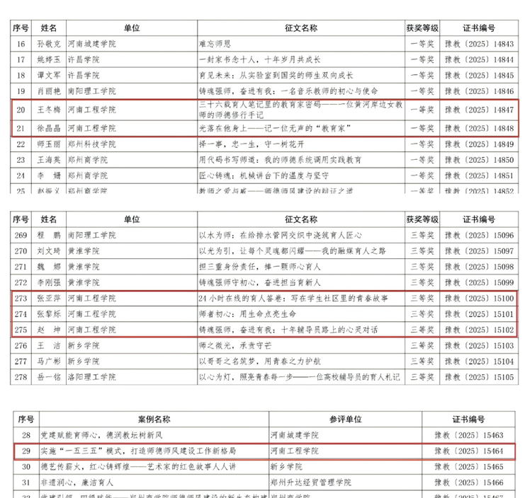 近日,由河南省教育厅主办的“铸魂强师,奋进有我”师德主题教育征文、演讲比赛及优秀案例评选结果揭晓,beat365官网喜获佳绩,荣获师德主题教育征文一等奖两项、三等奖三项,获师德师风建设优秀案例一项,beat365官网选送的作品全部获奖。