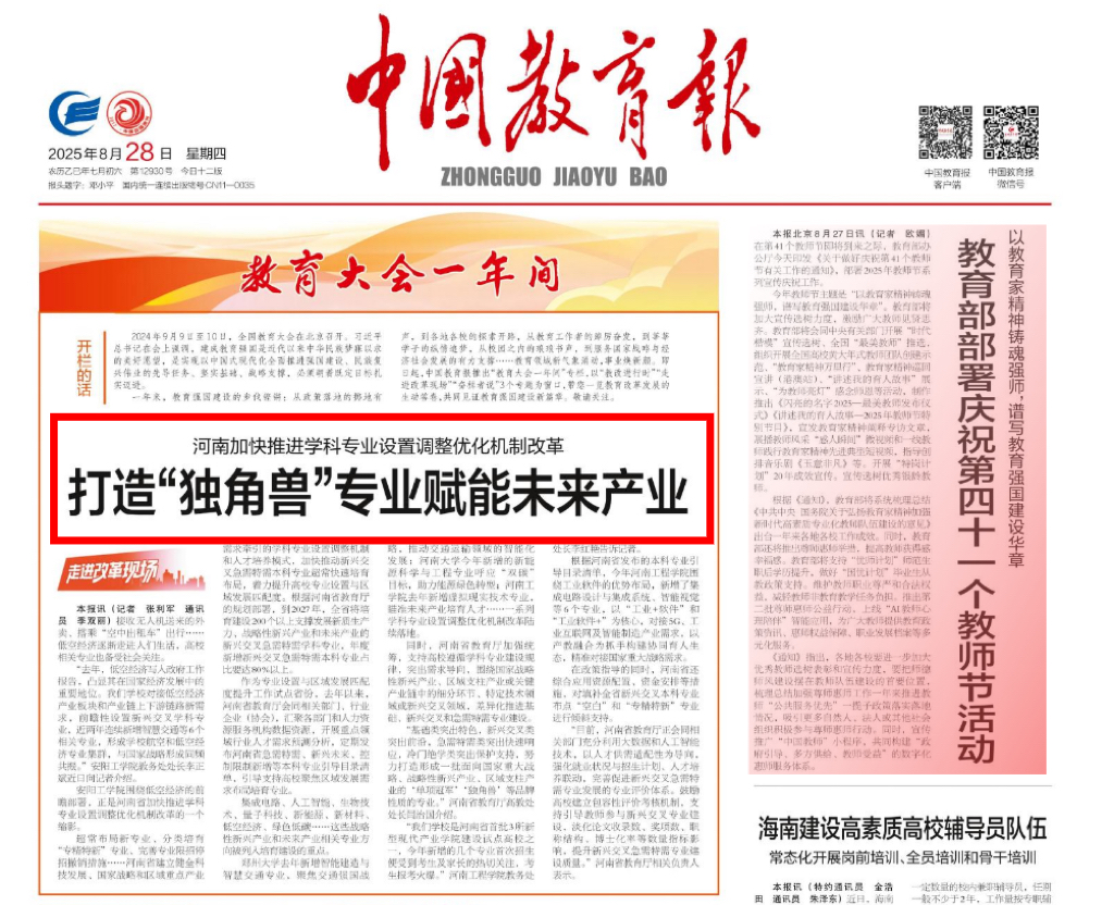 8月28日,《中国教育报》头版头条以《河南加快推进学科专业设置调整优化机制改革 打造“独角兽”专业赋能未来产业》为题,对河南在学科专业调整优化方面的举措进行报道,其中beat365正版唯一官网的相关成果备受关注。