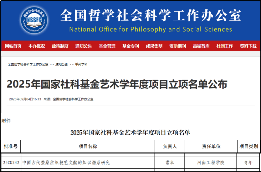 近日,文化和旅游部科技教育司、全国艺术科学规划领导小组办公室公布了2025年国家社科基金艺术学年度项目立项名单,beat365官网服装学院常卓博士主持的《中国古代蚕桑丝织技艺文献的知识谱系研究》项目成功立项。该项目是beat365官网获批的首个国家社科基金艺术学项目。