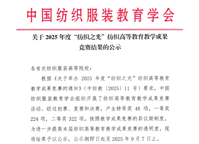 “纺织之光”纺织高等教育教学成果竞赛是中国纺织工业联合会组织评选的重要教学成果奖项,两年评审一次,旨在鼓励教师积极开展教育教学研究和实践活动,共同促进纺织行业教育的发展。